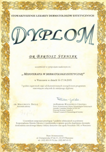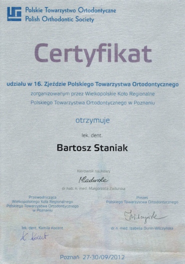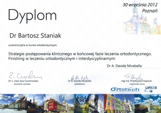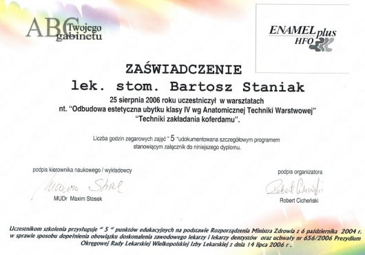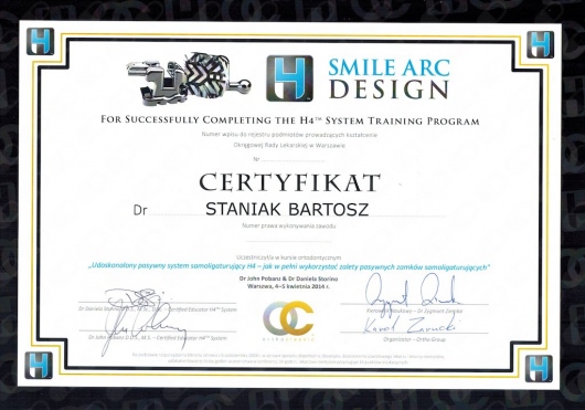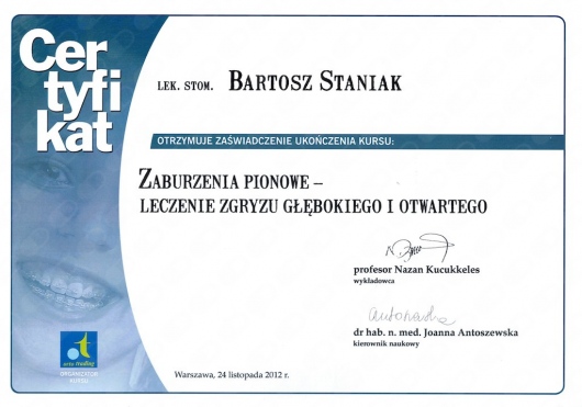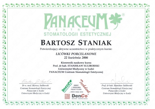 Bartosz Staniak jest lekarzem medycyny i stomatologii. Kontynuując rodzinne tradycje, studia medyczne ukończył na Uniwersytecie Medycznym w Poznaniu. Pomaga swoim pacjentom uzyskać hollywood smile, żeby mogli osiągnąć swoje zaplanowane cele osobiste i zawodowe. Jego zainteresowania to szeroko pojęte holistyczne podejście do zdrowia, poczucia własnej wartości, samorozwoju i samorealizacji człowieka.