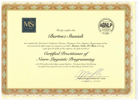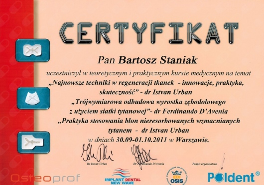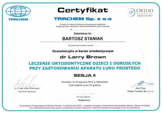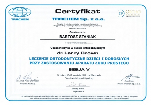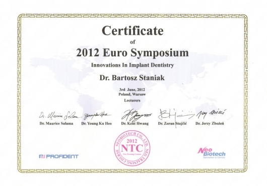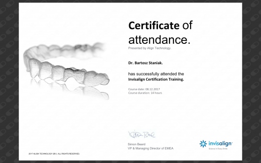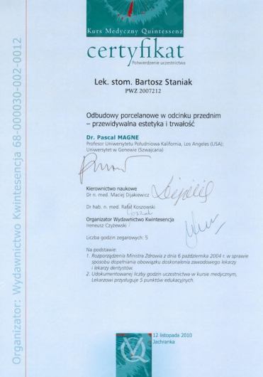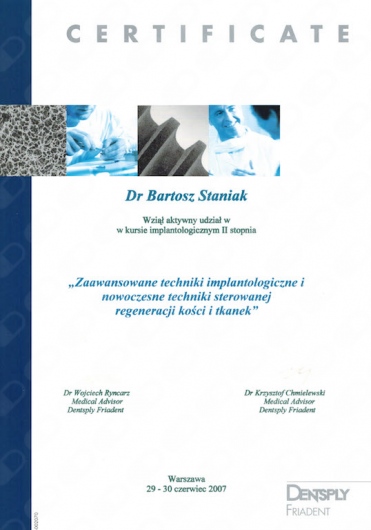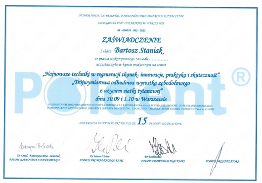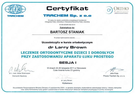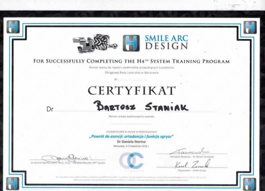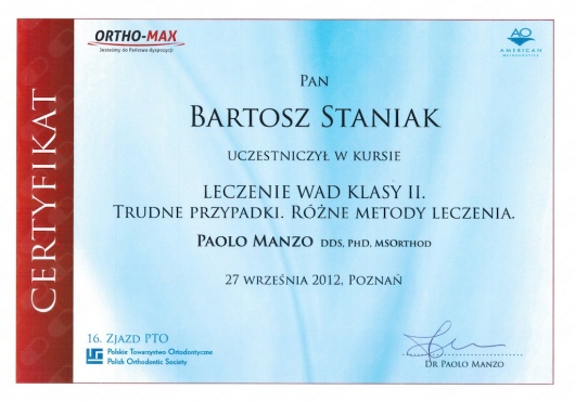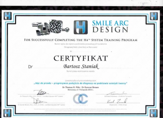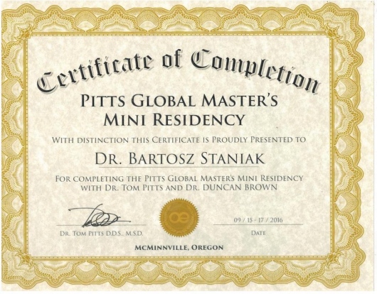 Jako jeden z dwóch lekarzy z Polski, ukończył zaawansowany, dwuletni kurs ortodontyczny Pitts Global Master’s Residency, uzyskując tytuł Master of Orthodontics. Na Uniwersytecie Medycznym Piotra i Marii Curie w Paryżu, uczył się implantologii i odbudowy kości, pod okiem doktora Pascala Valentini.