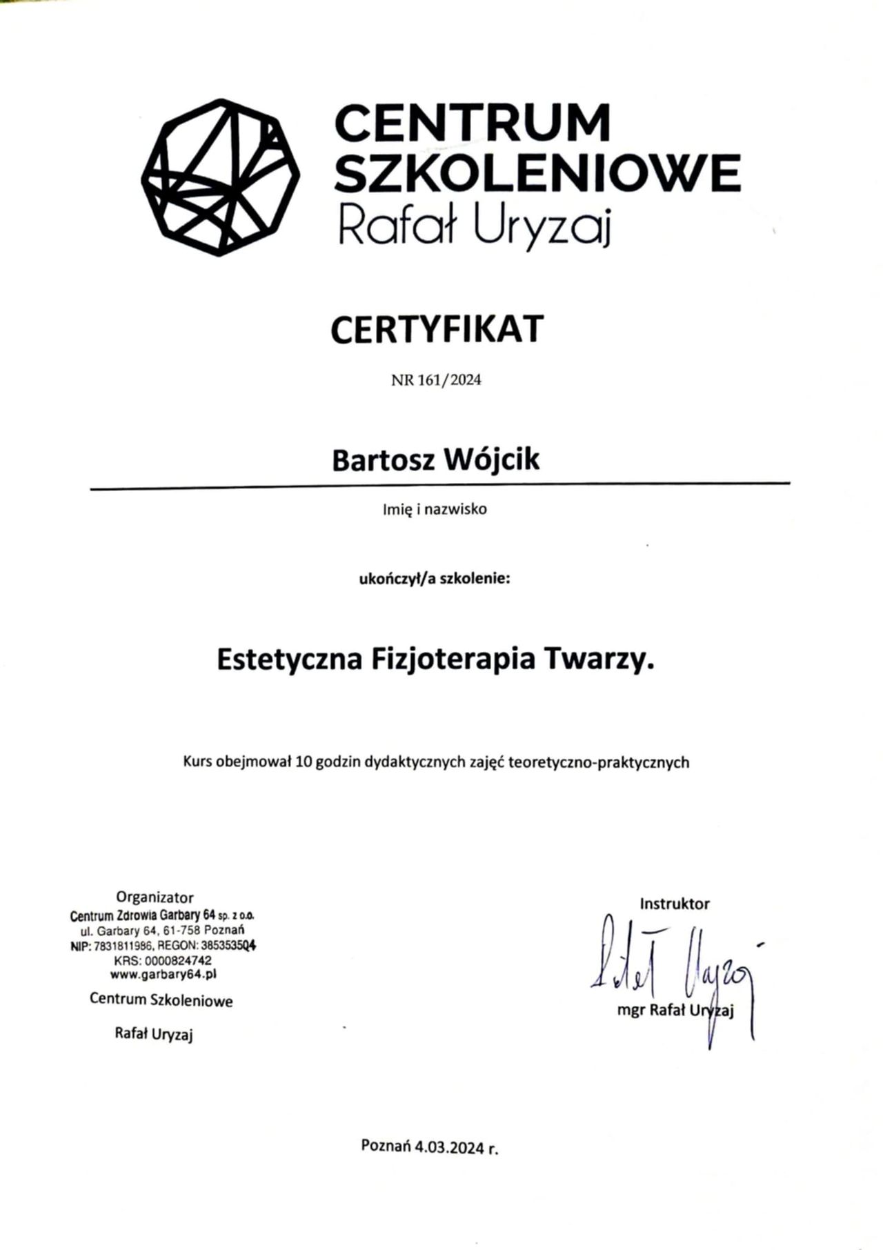 Jaki jest zakres porad oferowanych przez Bartosz Wójcik?Bartosz Wójcik to fizjoterapeuta. Na podstawie swojego doświadczenia i wykształcenia Bartosz Wójcik oferuje usługi takie jak: fizjoterapia, fizjoterapia estetyczna, fizjoterapia stomatologiczna, konsultacja fizjoterapeutyczna.