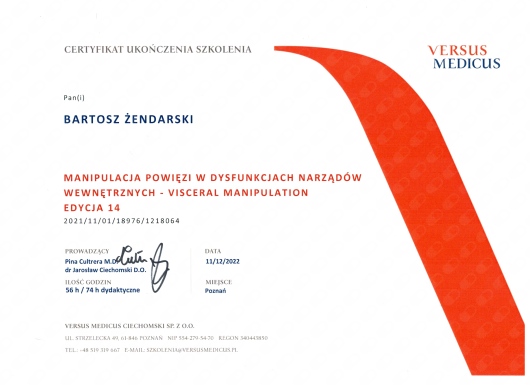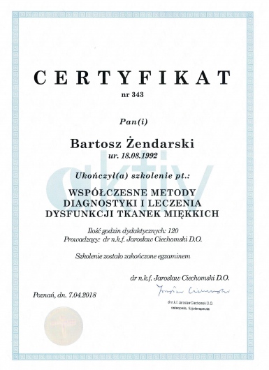 "Współczesne metody diagnostyki i leczenia dysfunkcji tkanek miękkich" Szkolenie uznane przez ZG PTF zakończone egzaminem, 2018r.