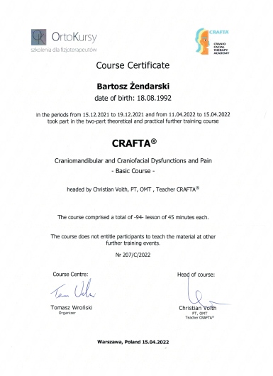 "CRAFTA" Leczenie problemów w obszarze czaszkowo-żuchwowym i czaszkowo-twarzowym; szkolenie podstawowe; 2022r.