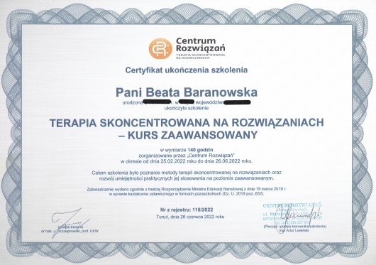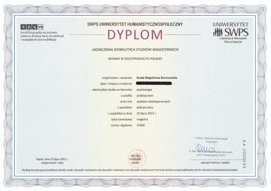 Bardzo polecam pracę z Panią Beatą Baranowską. Jest psychotetapeutką przy której można poczuć się bezpiecznie mówiąc o sobie. Jest osobą, która rozumie drugiego człowieka, przy której masz poczucie, że to, co mówisz jest wysłuchane i istotne. Pomaga spojrzeć na sprawę z różnych perspektyw, co bardzo pomaga. I -co również bardzo istotne szczególnie w tak wyjątkowych momentach, kiedy dzielimy się z kimś naszymi bardzo osobistymi sprawami- obdarza drugiego człowieka ogromnym szacunkiem. A praca z Panią Beatą przynosi zmianę, jest efektywna. Bardzo polecam.
