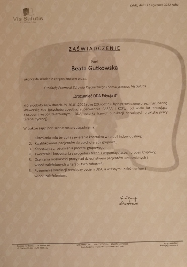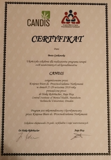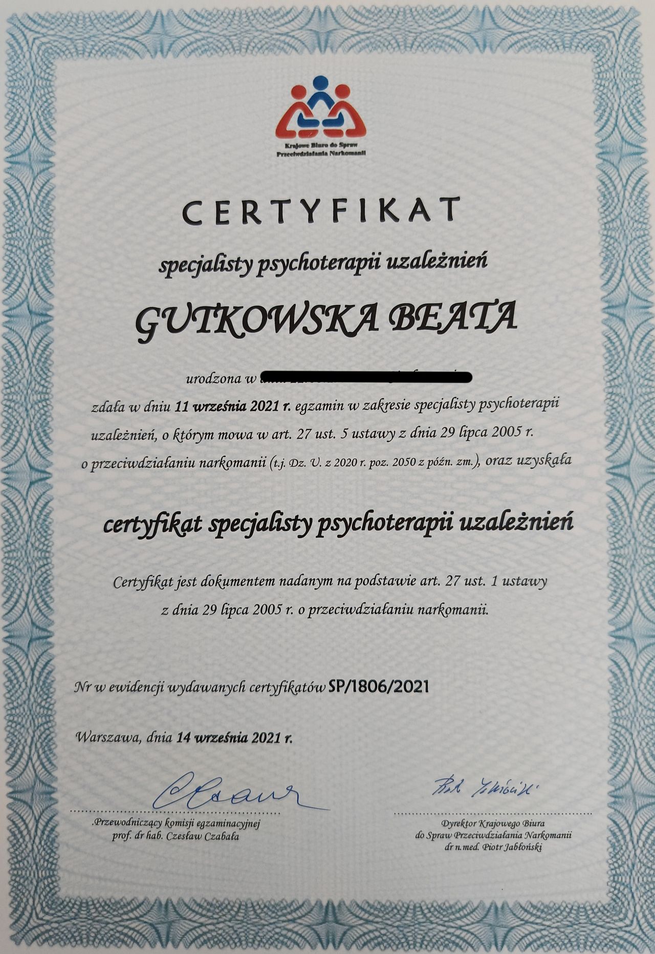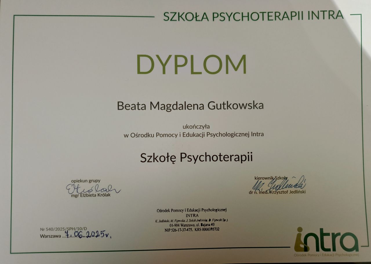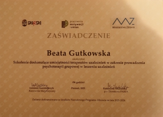 Jestem certyfikowaną Specjalistką Psychoterapii Uzależnień (SP/1806/2021), psychoterapeutką w nurcie humanistyczno-doświadczeniowym. Ukończyłam Szkołę Psychoterapii Intra. Posiadam certyfikat realizatora programu Candis dla osób szkodliwie używających i uzależnionych od marihuany. Brałam udział w licznych szkoleniach dotyczących psychoterapii uzależnień behawioralnych, prowadzenia psychoterapii grupowej w leczeniu uzależnień, psychoterapii osób tzw. DDA i współuzależnionych oraz focusingu w psychoterapii. Ukończyłam kurs terapii skoncentrowanej na emocjach - EFT poziom 1. Zajmuję się psychoterapią indywidualną osób dorosłych i młodzieży. Pomagam osobom uzależnionym od substancji psychoaktywnych i używającym szkodliwie oraz osobom uzależnionym behawioralnie. Pomagam członkom rodzin osób uzależnionych oraz osobom dorastającym w rodzinie z problemem uzależnienia. Swoje doświadczenie zdobywałam w Poradni Leczenia Uzależnień, Poradni Leczenia Uzależnień dla Dzieci i Młodzieży w Warszawie, w Poradni Terapii Uzależnienia od Alkoholu i Współuzależnienia oraz na Oddziale Terapii Uzależnień od Alkoholu w Szpitalu Nowowiejskim w Warszawie. Pracuję pod stałą superwizją.