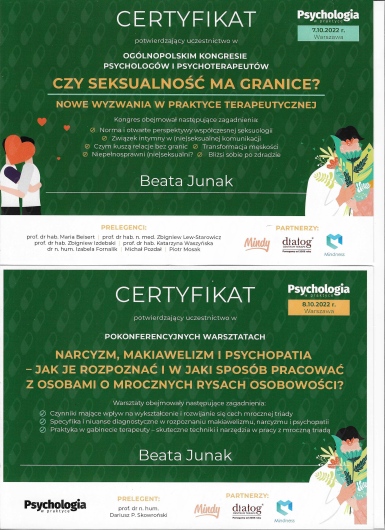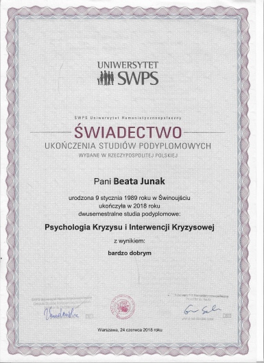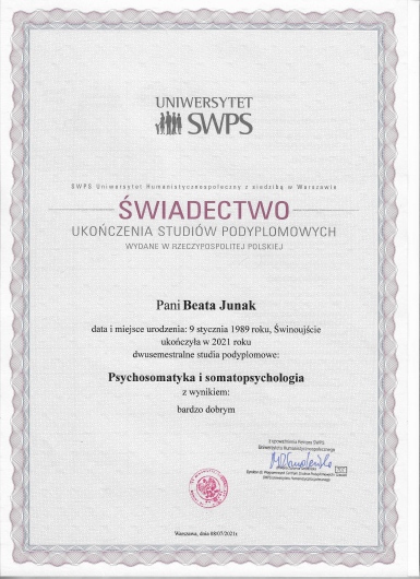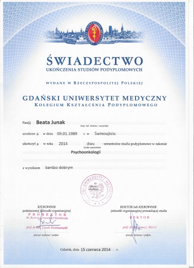 Jestem absolwentka Uniwersytetu im. Adama Mickiewicza w Poznaniu na kierunku Psychologia i studiów podyplomowych na kierunku Psychoonkologia, Psychologia Kryzysu i interwencji kryzysowej, Psychosomatyka i somatopsychologia oraz Diagnoza psychologiczna w praktyce klinicznej. Ukończyłam 4-letni kurs psychoterapii poznawczo-behawioralnej, aktualnie w trakcie zdobywania certyfikatu.