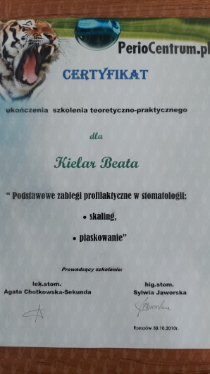 Na co dzień wykonuje zabiegi higienizacyjne takie jak piaskowanie, skaling, fluoryzacja oraz instruktaż jamy ustnej.