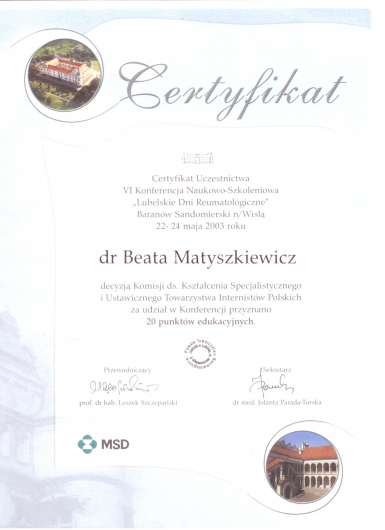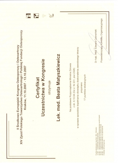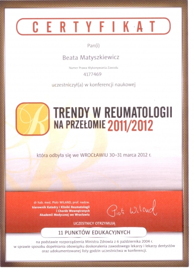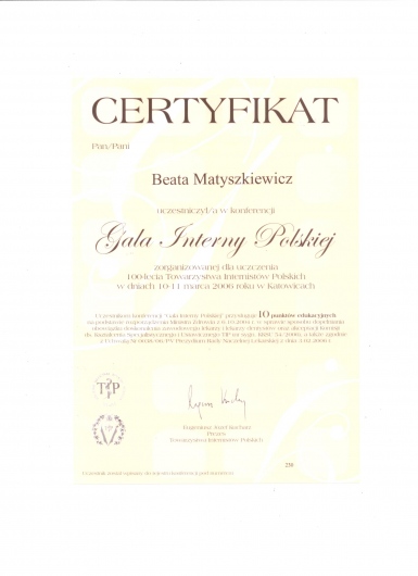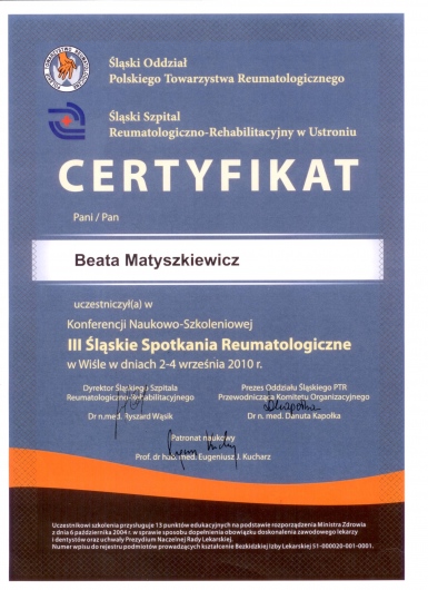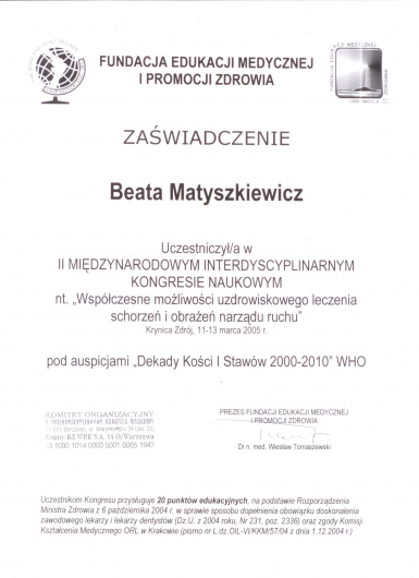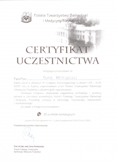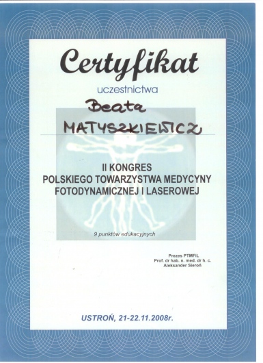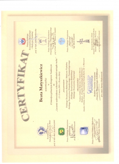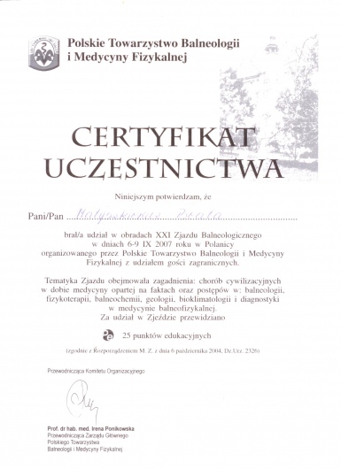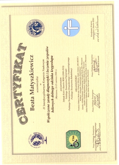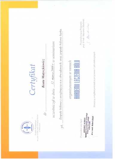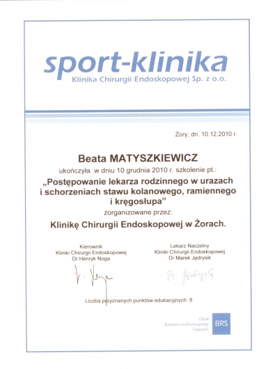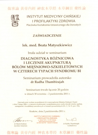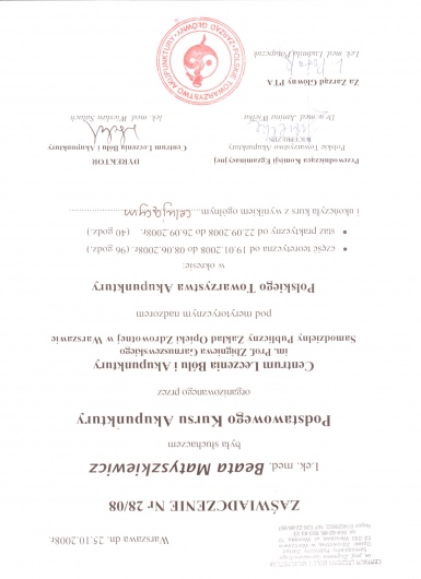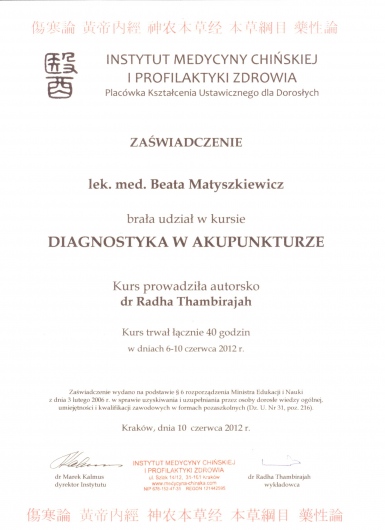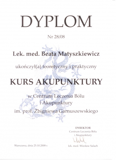 Ukończony kurs akupunktury dla lekarzy-Centrum Leczenia Bólu w Warszawie oraz kurs Tradycyjnej Medycyny Chińskiej-Compleo Katowice. Diagnostyka różnicowa i leczenie akupunkturą bólów mięśniowo szkieletowych. Diagnostyka w Akupunkturze -Radha Thambirajah, Instytut Medycyny Chińskiej Kraków. W trakcie 4 roku studiów Tradycyjnej Medycyny Chińskiej -Avicenna Instytut w Paryżu. Przyjmuję w Tychach, Bielsku-Białej i Goczałkowicach-Zdroju.
