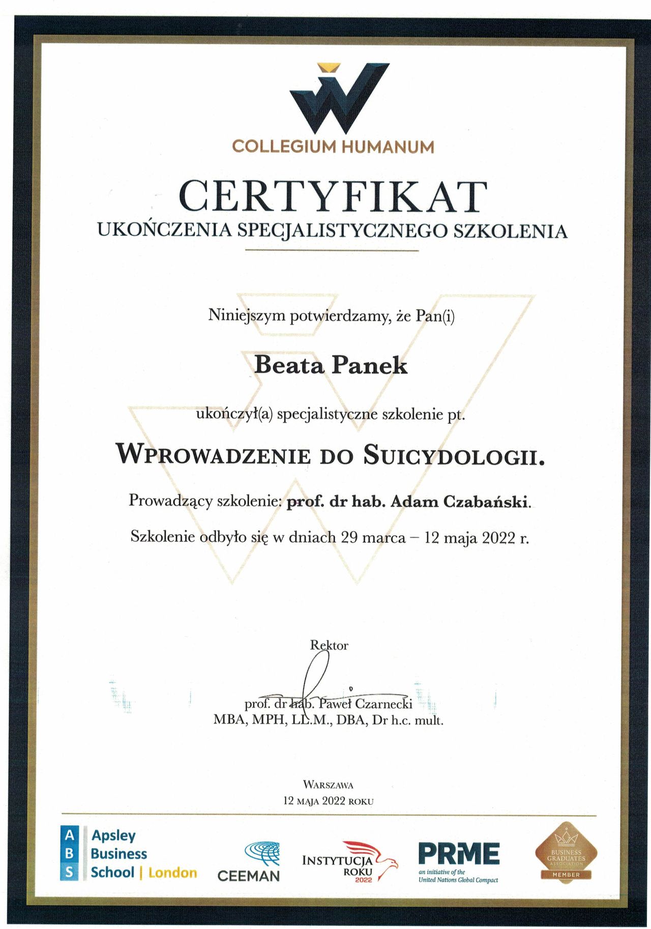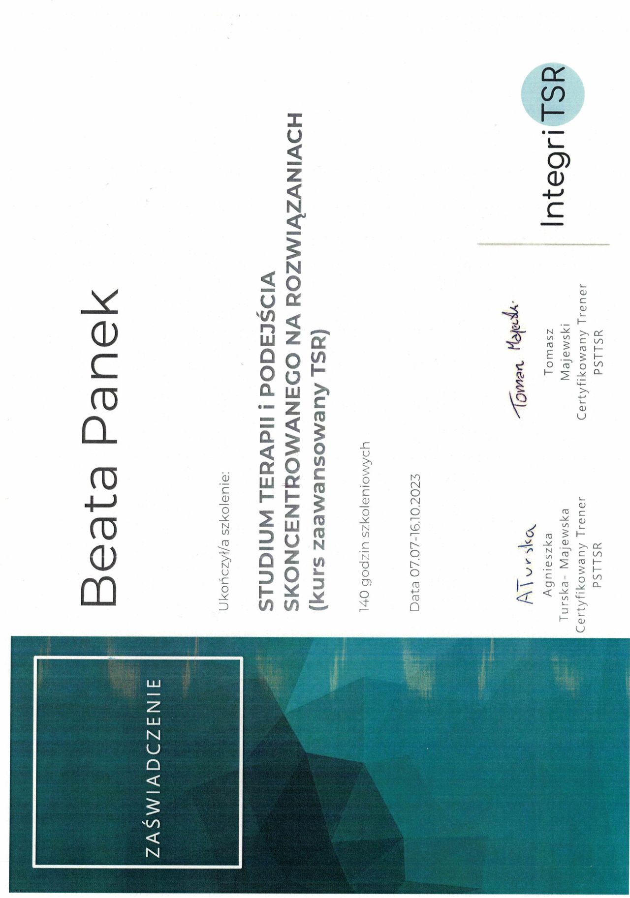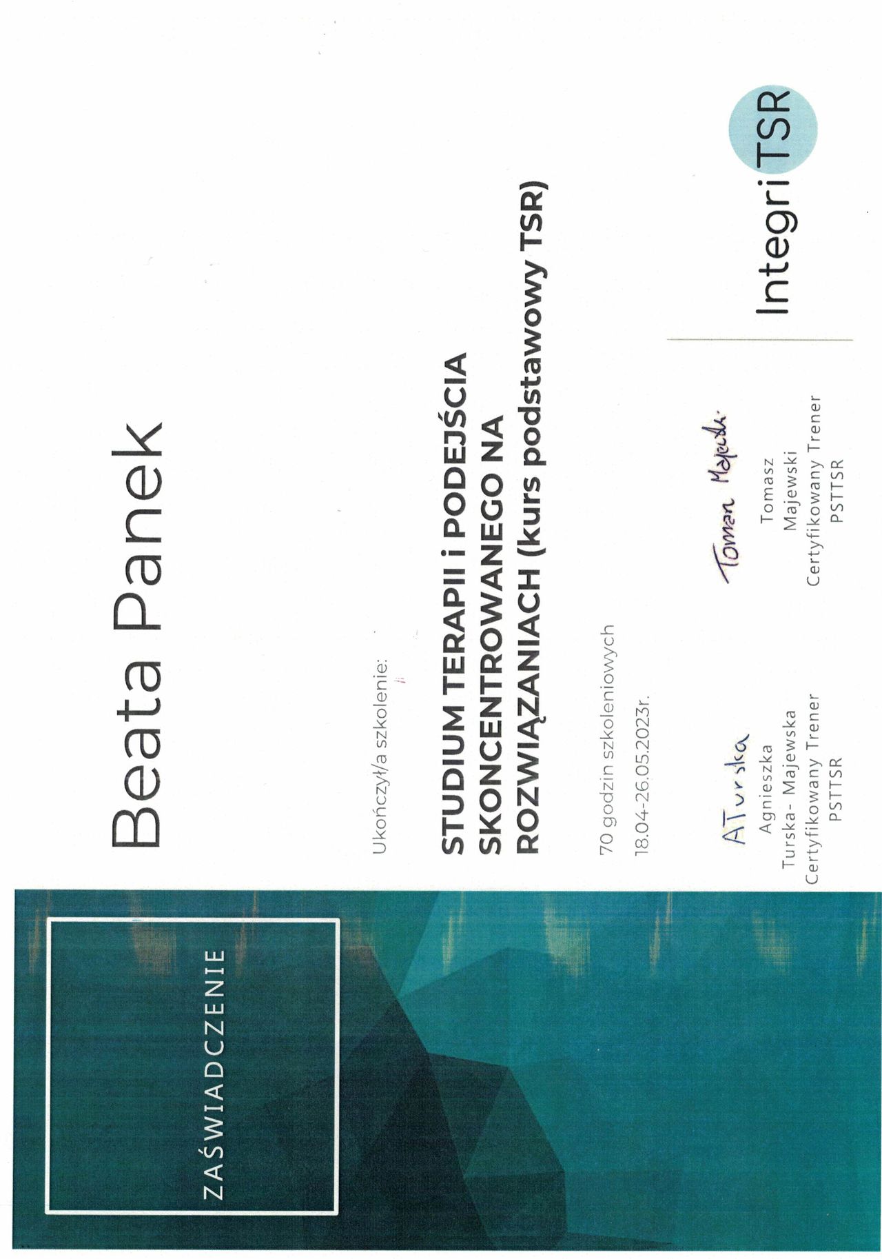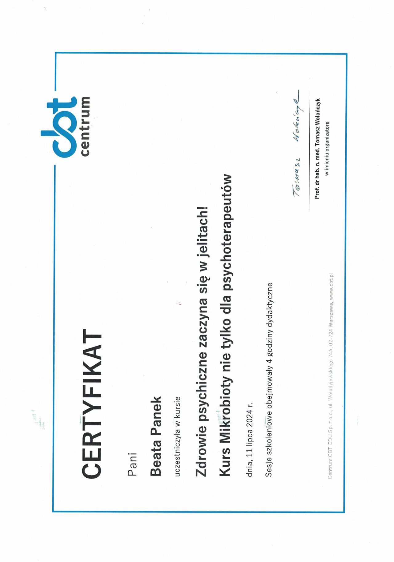 Swoje zainteresowania zawodowe rozwijam w nurcie terapii poznawczo-behawioralnej (CBT), który łączy naukową rzetelność z praktycznym podejściem do człowieka i jego emocji. Obecnie uczestniczę w 4-letnim szkoleniu psychoterapeutycznym w Szkole Psychoterapii „Centrum CBT”, posiadającej rekomendację Polskiego Towarzystwa Terapii Poznawczej i Behawioralnej (PTTPB), którego jestem członkiem.