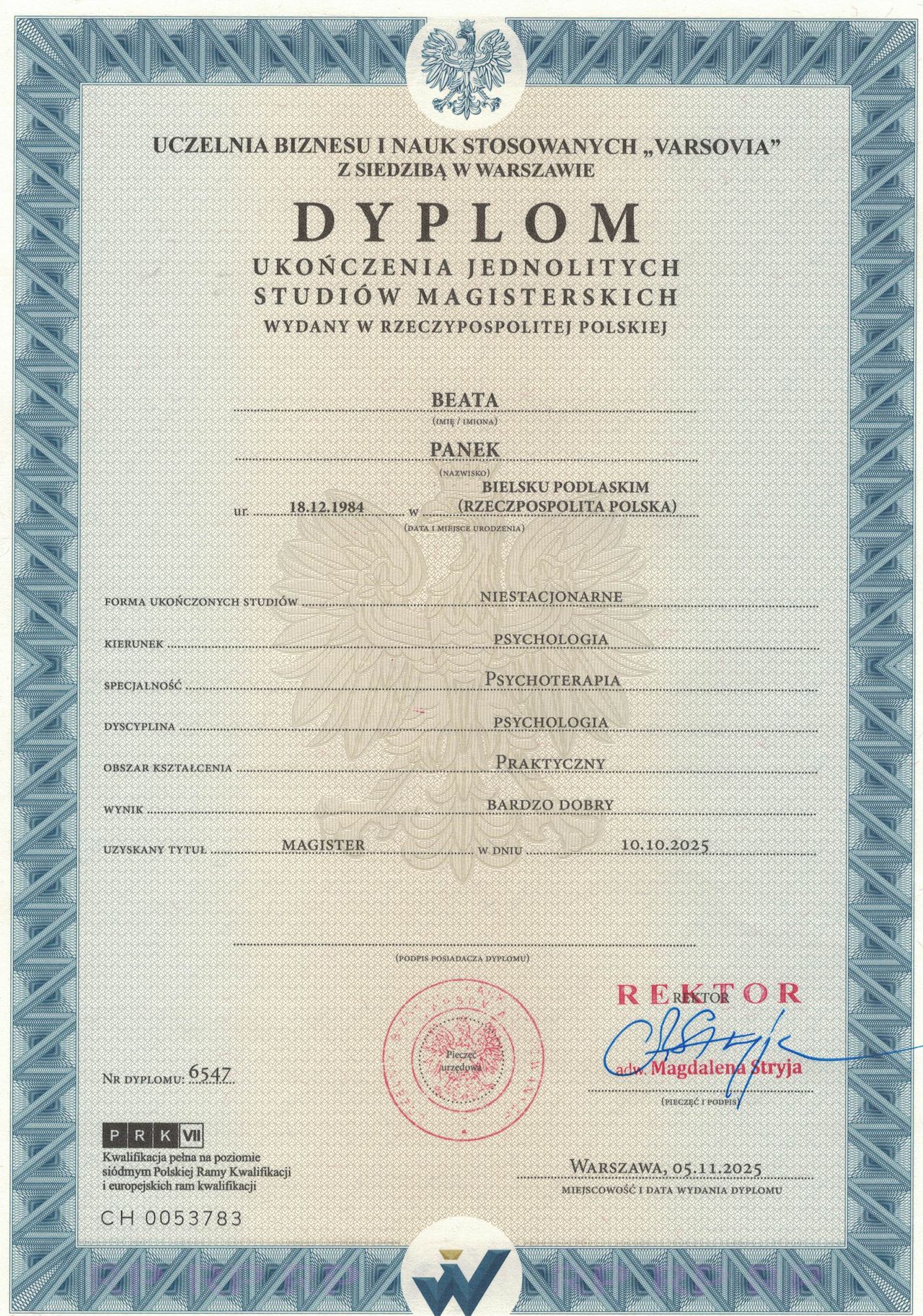 Ukończyłam studia magisterskie na kierunku Psychologia o specjalności psychoterapia, a także liczne szkolenia z zakresu diagnozy psychologicznej, zaburzeń lękowych, depresyjnych, osobowościowych i pracy z traumą. Dodatkowo zdobyłam kwalifikacje w zakresie terapii krótkoterminowej skoncentrowanej na rozwiązaniach (TSR), realizując I i II stopień szkolenia. Wiedzę z tego obszaru często wykorzystuję w pracy, wspierając pacjentów w dostrzeganiu własnych zasobów i małych kroków prowadzących do zmiany.