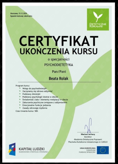 zdrowia, life-style i coachingu, które doskonale uzupełniają moją wcześniej zdobytą wiedzę, a następnie na kursie z psychodietetyki.