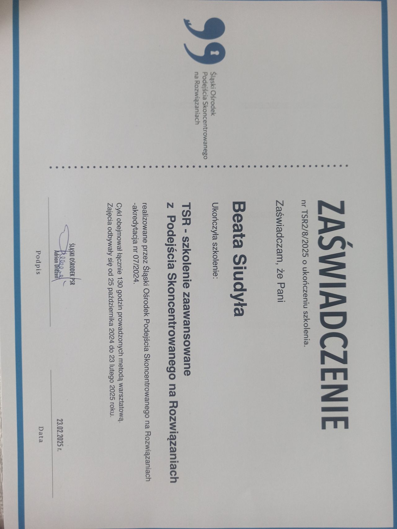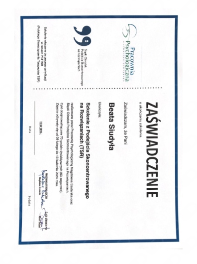 Jeśli czujesz, że potrzebujesz wsparcia, to jesteś we właściwym miejscu. Konsultacja psychologiczna jest często pierwszym krokiem w kierunku zmian a ja jestem tu, by Ci pomóc. Pracuję z osobami, które potrzebują wsparcia w radzeniu sobie z trudnościami emocjonalnymi, stresem, lękiem, stratą oraz różnego rodzaju wyzwaniami życiowymi. W swojej praktyce opieram się na założeniach terapii skoncentrowanej na rozwiązaniach, która pomaga klientom odkryć i wzmocnić ich wewnętrzne zasoby oraz skoncentrować się na osiąganiu konkretnych celów. W pracy kieruję się empatią, otwartością i chęcią realnego wsparcia osób, które zmagają się z trudnościami emocjonalnymi i życiowymi, co pozwala mi budować trwałe i efektywne relacje z klientami. Mam doświadczenie w pracy z dorosłymi, młodzieżą i parami. Wspieram rozwój emocjonalny i społeczny dzieci oraz młodzieży w placówkach edukacyjnych, prowadzę terapię psychologiczną w placówkach wsparcia psychologicznego, zdobywałam doświadczenie w poradni zdrowia psychicznego, jestem również wolontariuszem w linii wsparcia dla osób samotnych. Jestem psychologiem ze specjalnością neuropsychologia kliniczna i neurologopedia. Stale dbam o rozwój moich kompetencji uczestnicząc w kursach i szkoleniach. Jestem członkinią Polskiego Stowarzyszenia Terapeutów Terapii Skoncentrowanej na Rozwiązaniach (PSTTSR). Zapraszam osoby, które szukają profesjonalnej pomocy w atmosferze zrozumienia i akceptacji.