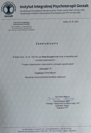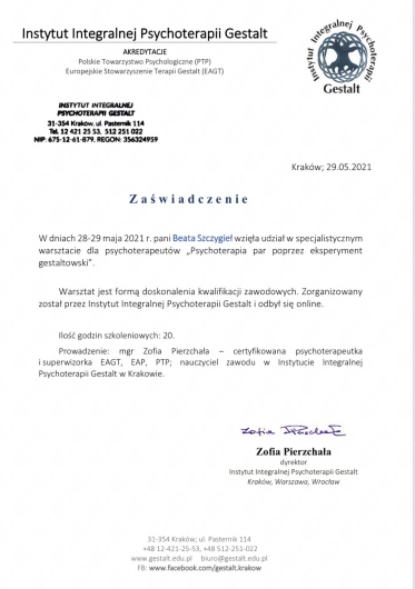 Jeśli zastanawiacie się nad wyborem psychoterapeutki – szczerze polecam Panią Beatę. Sama terapia, wiadomo, czasami bywa trudna, ale Pani Beata zawsze daje mi dużo wsparcia i zrozumienia. Jest bardzo przyjazna i naprawdę sympatyczna. Przy niej nie czuje skrępowania, mogę się wygadać, czasami też wypłakać. Czasami też razem się śmiejemy:-) Przy Pani Beacie zrozumiałam, że terapia ma sens. Zaczęłam rozumieć siebie, rozumieć swoich rodziców, powoli wychodzę na prostą.