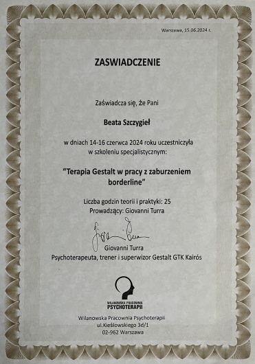 Do pani Beaty trafiłam w bardzo trudnym dla mnie momencie, całkowicie pozbawiona poczucia sprawczości i zagubiona. Podczas naszych spotkań powoli zrozumiałam przyczyny i schematy, które wpłynęły na to, jak obecnie się czuję i funkcjonuję. Na każdym etapie terapii doświadczyłam z jej strony ogromnej akceptacji i wsparcia. Pani Beata tworzy bezpieczną przestrzeń pełną empatii i zrozumienia. Do każdej kwesti podchodzi poważnie i z takim samym zaangażowaniem. Jej trafne spostrzeżenia i pytania zawsze pozwalały mi spojrzeć na problem z innej perspektywy. Pani Beata nauczyła mnie jak radzić sobie z trudnymi emocjami i myślami, zadbać o siebie i cieszyć się życiem, takim jakie jest. Dzięki terapii udało mi się lepiej poznać siebie i swoje potrzeby. Jestem bardzo zadowolona z postępów, które udało nam się osiągnąć do tej pory.