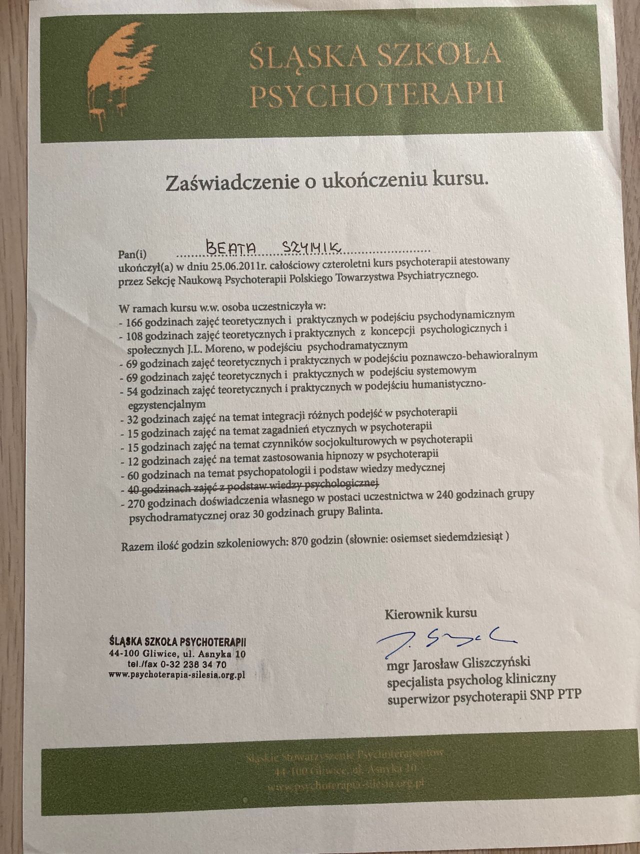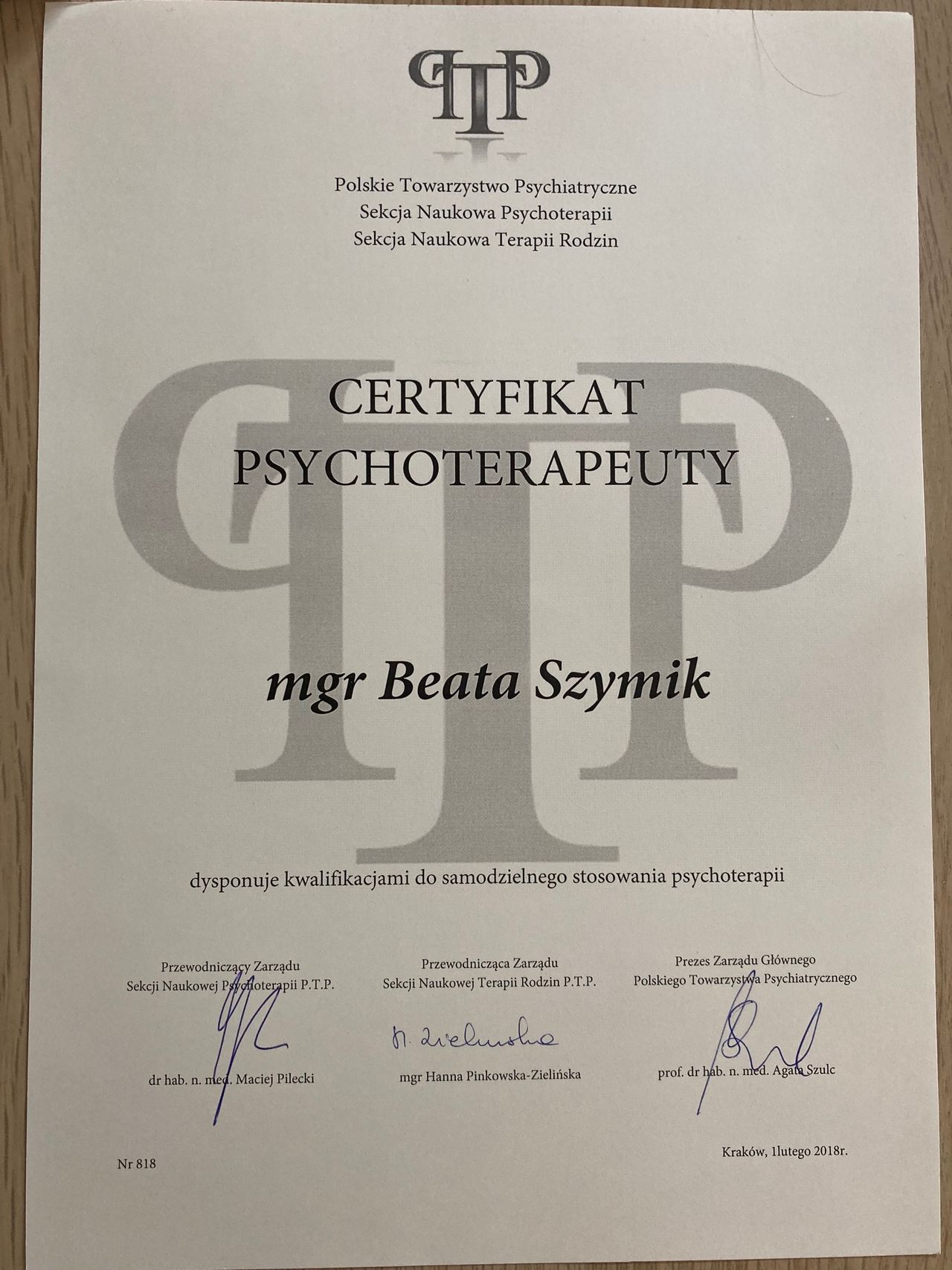 Nazywam się Beata Szymik – jestem certyfikowanym psychoterapeutą Polskiego Towarzystwa Psychiatrycznego (nr certyfikatu 818) oraz superwizorem aplikantem. Na co dzień prowadzę psychoterapię indywidualną dorosłych i młodzieży, a także oferuję superwizje dla psychoterapeutów i osób w trakcie szkolenia.