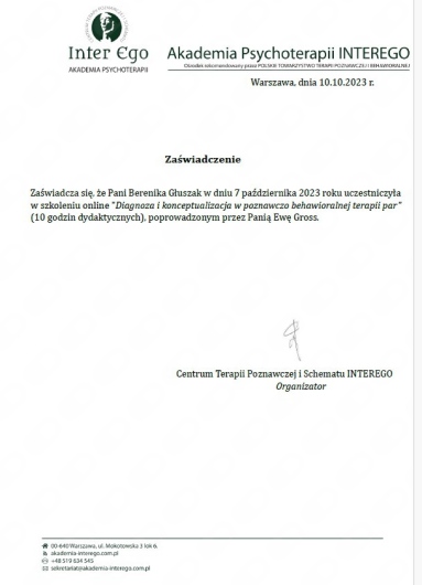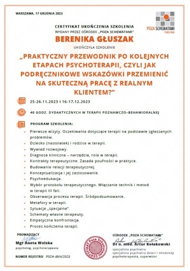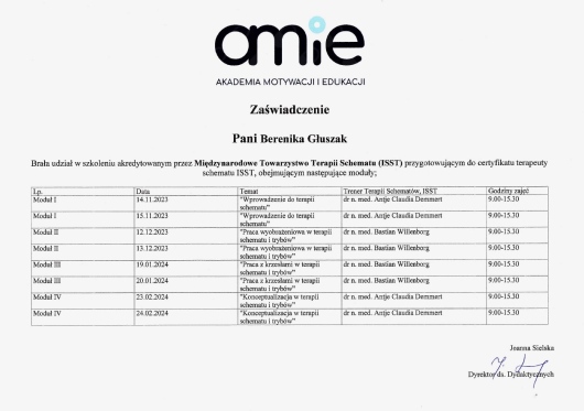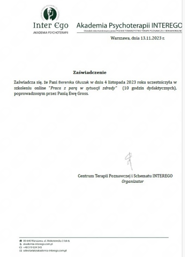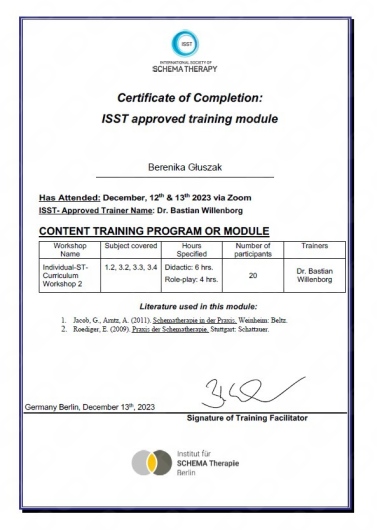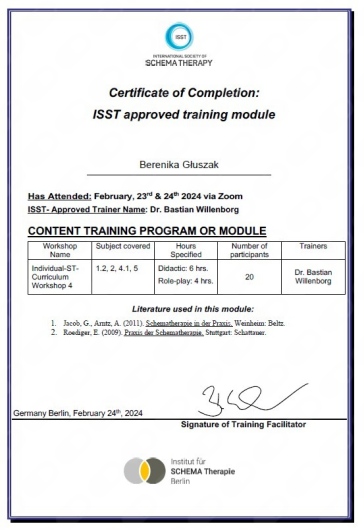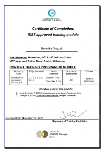 Psycholog i psychoterapeuta CBT w trakcie certyfikacji, specjalizująca się w Terapii Schematów oraz wykorzystująca techniki Terapii Dialektyczno-Behawioralnej (DBT), Racjonalnej Terapii Zachowań oraz Terapii Akceptacji i Zaangażowania. Moja praca opiera się na głębokiej empatii i indywidualnym podejściu, z naciskiem na budowanie relacji opartej na zaufaniu. Jako terapeuta, towarzyszę ludziom w trudnych i wyjątkowych momentach życia, pomagając odkryć ich prawdziwą wartość. Moje podejście oparte jest na empatii i indywidualizmie, z naciskiem na budowanie relacji opartej na zaufaniu oraz przyjaznej atmosfery podczas sesji. Pracuję w nurcie terapii schematów: Terapia schematów zdobywa coraz większe uznanie w oczach specjalistów i pacjentów, co można przypisać jej udokumentowanej skuteczności oraz intrygującym podstawom teoretycznym. Jest oparta na koncepcji, że zaspokojenie podstawowych potrzeb jest kluczowe dla zdrowego rozwoju psychicznego dzieci. Jednym z unikalnych aspektów tej terapii jest zintegrowanie różnych, ugruntowanych teorii i technik terapeutycznych, takich jak teoria przywiązania, terapie poznawczo-behawioralne, czy terapie doświadczeniowe co przyczynia się do jej atrakcyjności i wszechstronności. Terapia schematów wyróżnia się możliwością adresowania i przetwarzania trudnych kwestii, takich jak problemy w relacjach czy bolesne doświadczenia z przeszłości, które są często pomijane w tradycyjnych formach terapii. To podejście przyciąga uwagę, oferując nadzieję na głębsze rozwiązanie problemów, nie tylko przez łagodzenie objawów, ale także promując dążenie do pełniejszego, bardziej satysfakcjonującego życia. Terapeuci i ich pacjenci znajdują w tej metodzie cenne wsparcie, które przybliża ich do osiągnięcia trwałego dobrostanu psychicznego. Pierwsze spotkanie to konsultacja w formie luźnej rozmowy, następnie umówimy się na termin stałej terapii, czas oczekiwania od 4 do 6 miesięcy. Pomogę Ci właściwie je sformułować. Po takim spotkaniu zastanowisz się, czy chcesz skorzystać z mojej pomocy. Poświęć na to tyle czasu, ile potrzebujesz. Gdy zdecydujesz się na podjęcie współpracy – umówimy termin stałych wizyt (czas oczekiwania od 4 do 6 miesięcy). Terapia schematu to proces indywidualny. Nie da się z góry określić, jak długo potrwa. Da się natomiast ustalić, że na jej końcu będziesz znać samego siebie o wiele lepiej. Terapię zakończymy, gdy uznasz, że doskonale poznałeś swój system schematów i umiesz sobie z nimi radzić. Szkolenia i warsztaty: 4-letni kurs psychoterapii w nurcie behawioralno – poznawczym (CBT) Szkolenie: Kluczowa Moc Relacji Terapeutycznej w Terapii Schematu Praktyczny przewodnik po kolejnych etapach psychoterapii, czyli jak podręcznikowe wskazówki przemienić na skuteczną pracę z realnym klientem “Poza schematami” Akademia Terapii schematu “Amie” Praca z pacjentami z zaburzeniami odżywiania “Instytut Terapii Schematu” Warsztat pracy z krzesłami w terapii schematu Szkolenie: Rodzino zadbaj o siebie. 7 przykazań rodziny /De Barbaro Szkolenie: Skuteczne metody i podejścia terapuetyczne Warsztaty: Dialog motywujący Warsztaty: Terapia Schematu Warsztaty: Racjonalna Terapia Zachowania, Praca terapeutyczna z parą z włączeniem wątków seksualnych Szkolenie ACT Szkolenie w terapii par w nurcie terapii schematu “Interego”: diagnoza i konceptualizacja w terapii par CBT praca z parą w sytuacji zdrady.