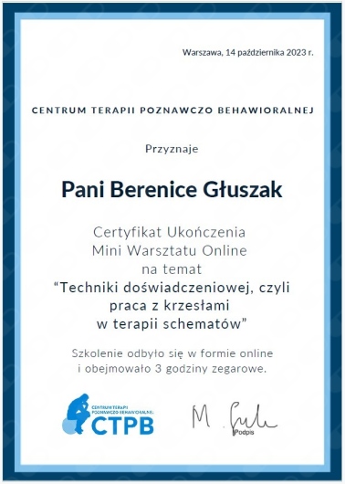 Serdeczne podziękowania dla Pani Bereniki za pomoc i wsparcie w trudnym dla mnie okresie.Pełen profesjonalizm,zaangażowanie ,miła atmosfera i dobra energia sprawia że człowiek czuje się komfortowo w gabinecie.Gorąco polecam wszystkim którzy szukają pomocy i wsparcia .
