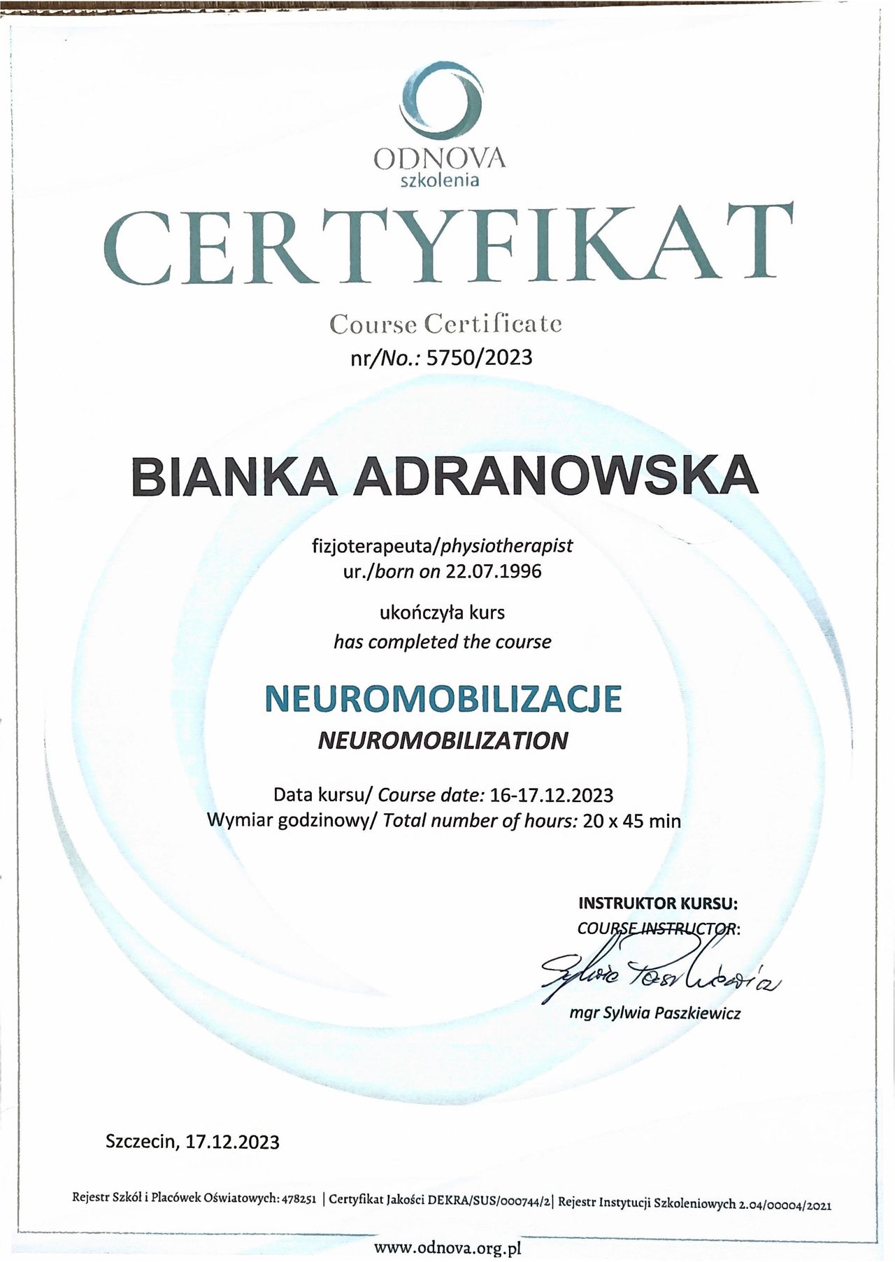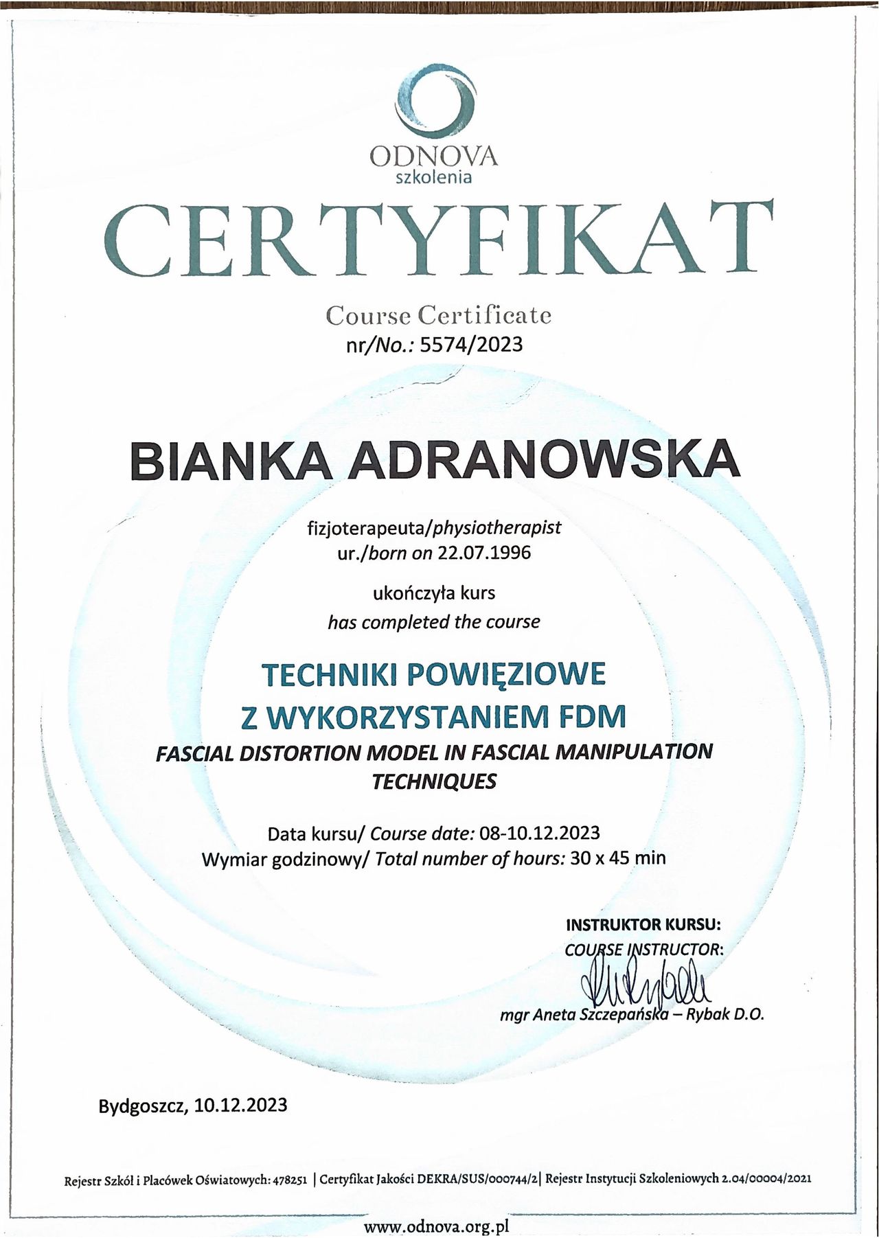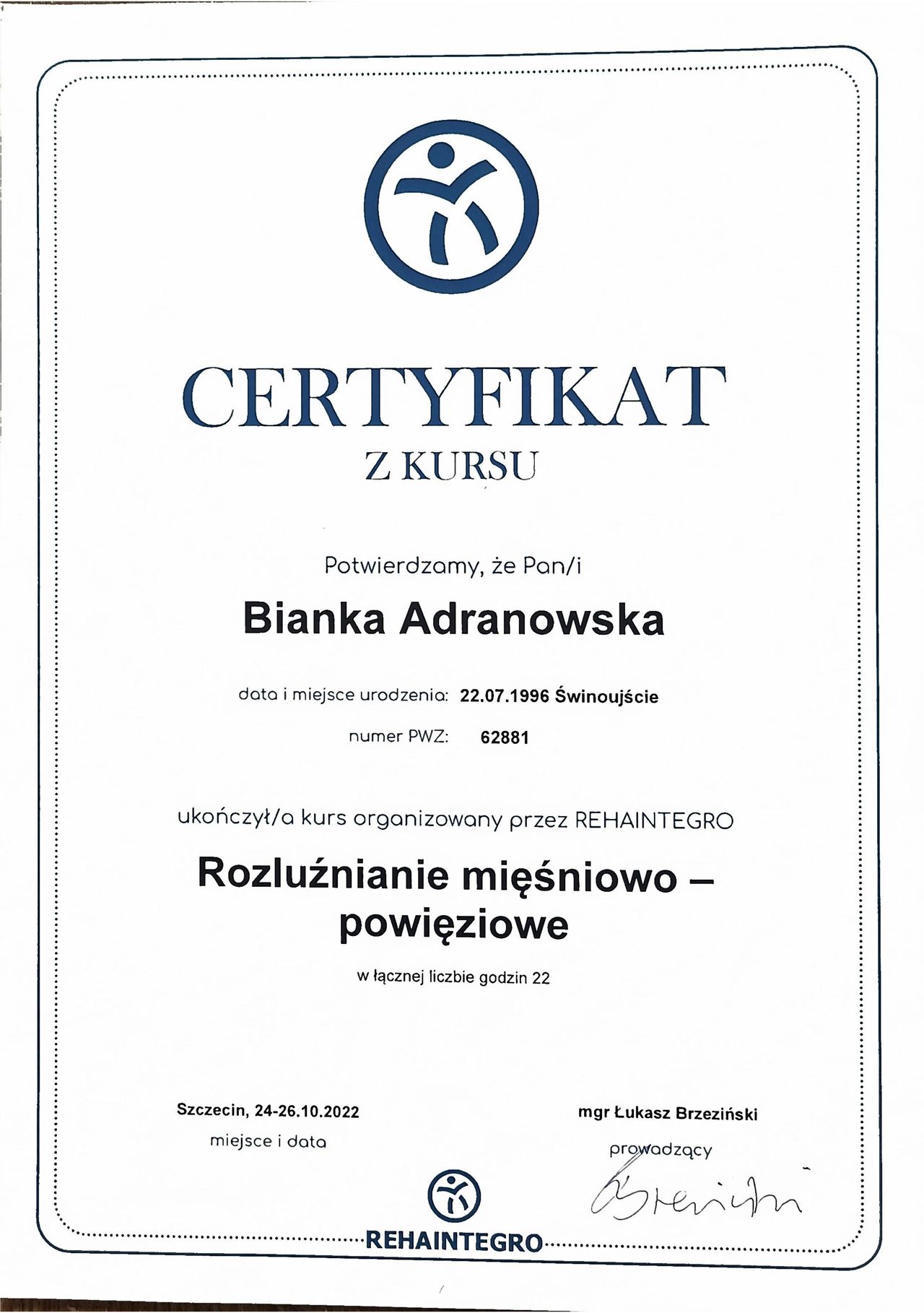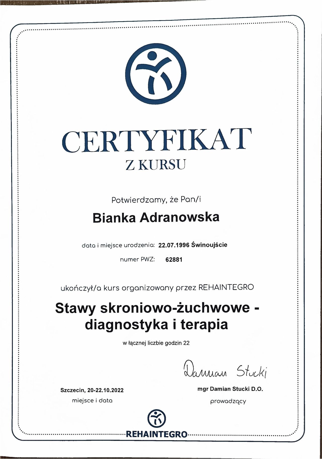 Szczególne miejsce w mojej praktyce zajmuje terapia stawu skroniowo-żuchwowego (SSŻ), która stała się moją pasją. Pomagam osobom cierpiącym m.in. na ból żuchwy, szczękościsk, trzaski w stawie, bruksizm czy bóle głowy związane z dysfunkcjami SSŻ. Regularnie poszerzam swoją wiedzę, uczestnicząc w specjalistycznych szkoleniach, aby oferować skuteczne i nowoczesne metody terapii.