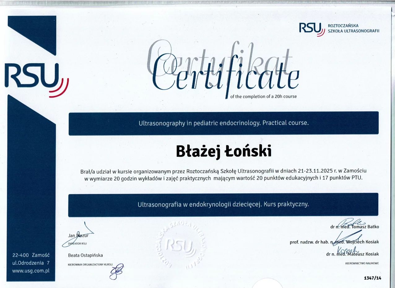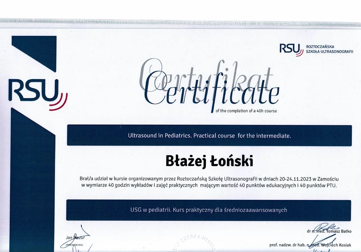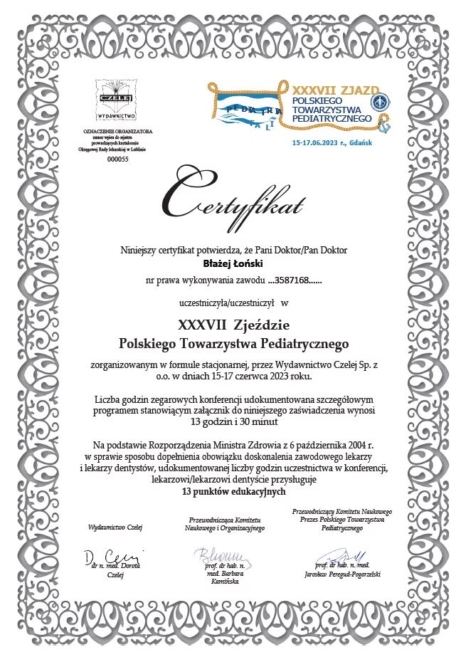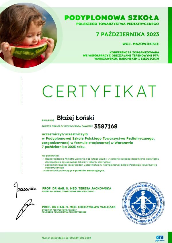 Jestem aktywnym członkiem Polskiego Towarzystwa Pediatrycznego. Posiadam certyfikat Polskiego Towarzystwa Ultrasonograficznego z zakresu USG w Pediatrii. Stale podnoszę swoje kwalifikacje poprzez udział w licznych kongresach o tematyce pediatrycznej i ultrasonograficznej.