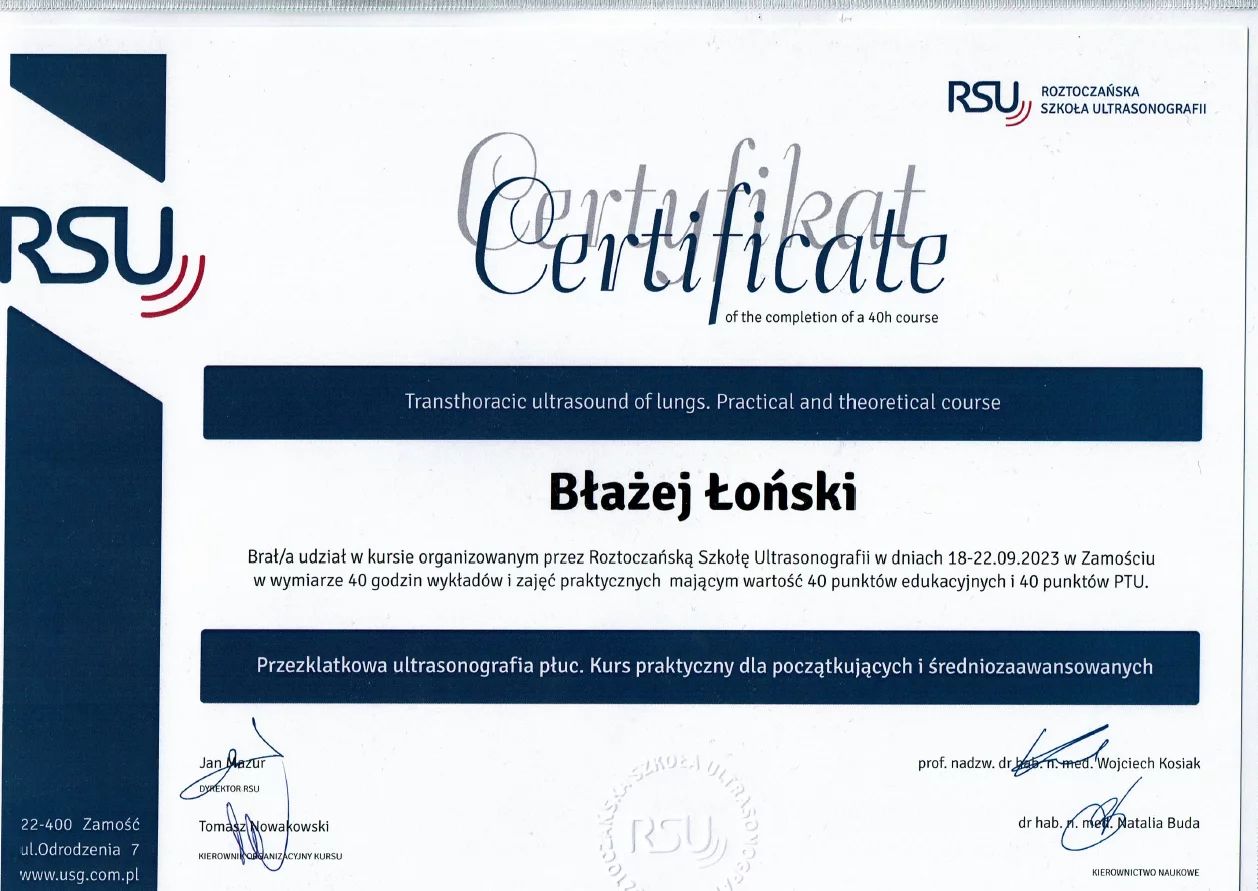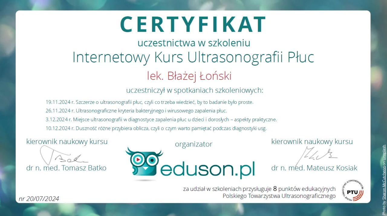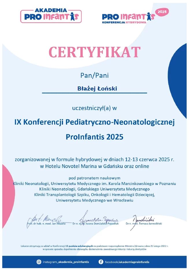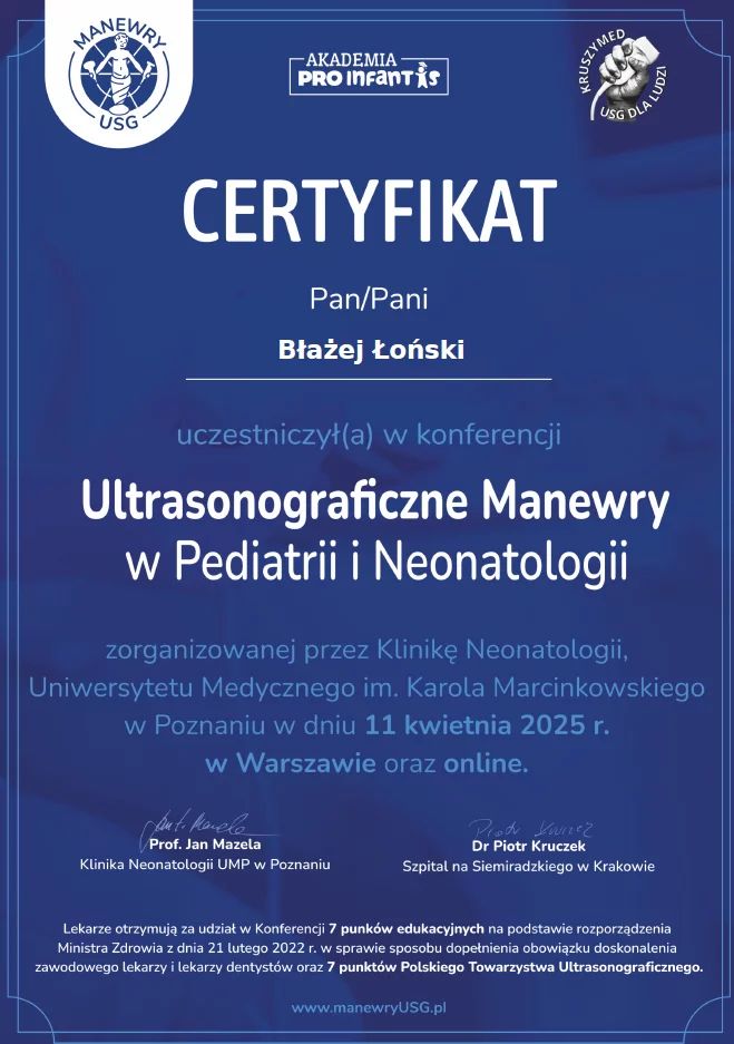 Jestem aktywnym członkiem Polskiego Towarzystwa Pediatrycznego. Posiadam certyfikat Polskiego Towarzystwa Ultrasonograficznego z zakresu USG w Pediatrii. Stale podnoszę swoje kwalifikacje poprzez udział w licznych kongresach o tematyce pediatrycznej i ultrasonograficznej.
