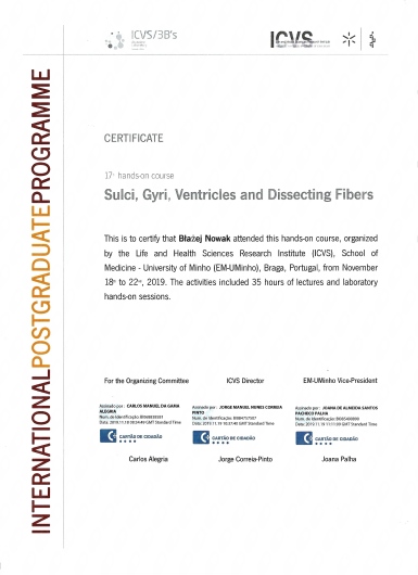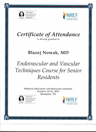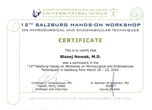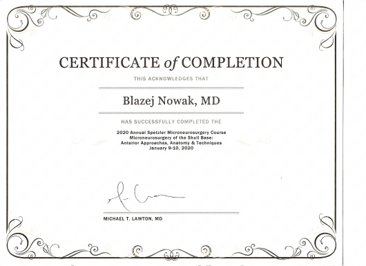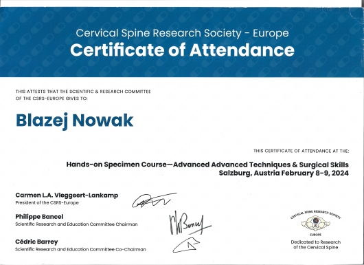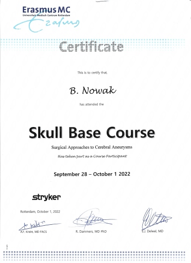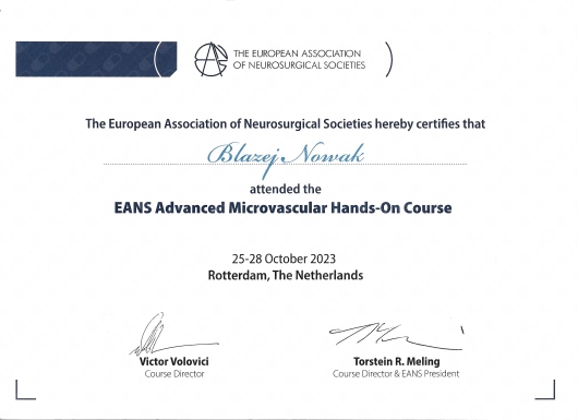 W latach 2017-2023 odbyłem szkolenie specjalizacyjne w dziedzinie neurochirurgii, początkowo w Klinice Neurochirurgii Państwowego Instytutu Medycznego w Warszawie, a następnie w Oddziale Neurochirurgii Szpitala Zachodniego w Grodzisku Mazowieckim. Od początku pracy zawodowej odbywałem liczne staże zagraniczne w renomowanych ośrodkach neurochirurgicznych m.in: