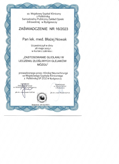 Trafiłam do Szpitala w Grodzisku Mazowieckim gdzie pracuje Pan dr Błażej Nowak. Stwierdzono u mnie guza mózgu glejaka. Pan dr podjął się operacji choć był to trudny przypadek bo guz był duży. Po operacji (była w lutym 2025r) czuję się dobrze, mówię, logicznie myślę, chodzę, widzę, słyszę. Bardzo się cieszę że trafiłam na Pana Błażeja Nowaka lekarza profesjonalistę z wielką wiedzą i umiejętnościami. To przyjemny, życzliwy i pogodny człowiek. Jest bardzo dobrze zorientowany w każdym przypadku pacjentów których prowadzi i poświęca swój czas, żeby odpowiedzieć na ich pytania oraz rozwiać wątpliwości. Będę mu wdzięczna do końca życia za pomoc i uczciwe podejście do pacjenta. Z wyrazami szacunku, polecam Neurochirurga Błażeja Nowaka. Po operacji skierował mnie na oddział onkologiczny na radioterapię w Warszawie. Teraz jestem w trakcie leczenia onkologicznego i mam nadzieję, że uda mi się wyzdrowieć.
