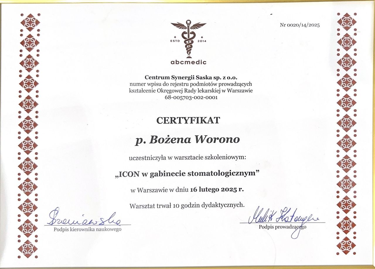 Swoją drogę zawodową zaczęła w Szkole Medycznej na Ząbkowskiej. Dziś pracuje w jednym z najbardziej wymagających obszarów stomatologii — periodontologii i chirurgii. Na co dzień towarzyszy lekarzowi przy zabiegach pokrywania recesji, regeneracji tkanek i leczeniu chorób przyzębia. Dzięki temu doskonale rozumie, z czym mierzą się pacjenci z wrażliwymi dziąsłami i potrafi zadbać o nich tak, by higienizacja nie była tylko „czyszczeniem”, lecz realnym wsparciem w terapii.