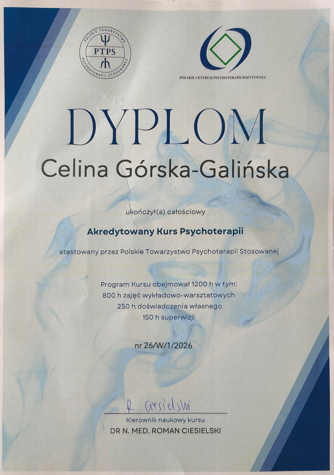 Jestem dyplomowaną psychoterapeutką po 5 letnim szkoleniu w nurcie Transkulturowa Psychoterapia Pozytywna, ukończyłam również szkolenia m.in: TRS , oraz szkolenia podyplomowe: Mediatora oraz trenerki empatycznej komunikacji w nurcie NVC. Prowadzę konsultacje oraz psychoterapię dla osób dorosłych w zakresie przezwyciężania kryzysów emocjonalnych, konfliktów, ogólnie pojętych życiowych trudności. Prowadzę psychoedukację , warsztaty dla rodziców, nauczycieli, specjalistów, dzieci i młodzieży. Praktykę zdobywałam podczas kilkuletniej pracy m.in. w Centrum Interwencji Kryzysowej oraz Fundacji Dajemy Dzieciom Siłę. Dbając o jakość oferowanej pomocy, odbyłam własną psychoterapię oraz regularnie superwizuję swoją pracę. Należę do Światowego Stowarzyszenia Psychoterapii Pozytywnej i Transkulturowej z siedzibą w Wisbaden w Niemczech. Obecnie uczestniczę w 1,5 rocznym szkloleniu uzupełniającym z zakresu terapii Ericsonowskiej i Systemowej.