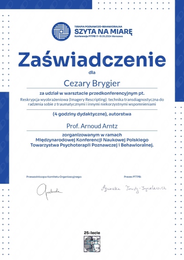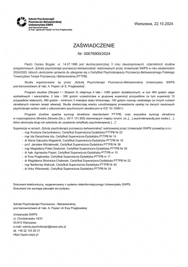 Moją pracę regularnie poddaję superwizji prowadzonej przez certyfikowanego superwizora. Jestem również członkiem Polskiego Towarzystwa Terapii Poznawczej i Behawioralnej.