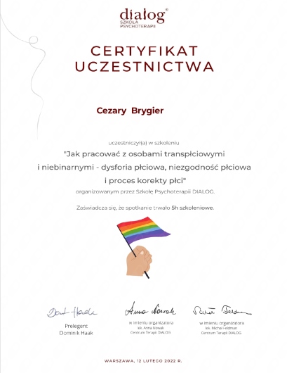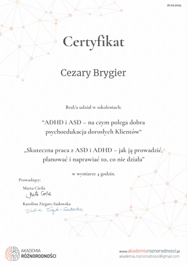 Bardzo polecam Cezarego. Spotkania z nim bardzo mi pomagają, układają mi dużo rzeczy w głowie, ale bez niepotrzebnego "niańczenia". Czuję, że pracuję ze specjalistą, który kieruje się moim dobrem i tym co jest potwierdzone naukowo - czuję się z nim bezpiecznie jako osoba z ASD, ADHD i jako osoba LGBTQ+