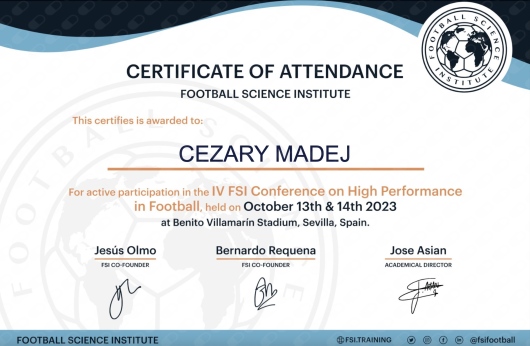 Doświadczenie nabywałem również biorąc udział w konferencjach takich jak: IV Football Science Institute Conference - High Performance in Football (Sevilla, 2023), V Football Science Institute Conference - High Performance in Football (Monterrey - online, 2024), VI Football Science Institute Conference - High Performance in Football (Sevilla, 2024) oraz wykonując staże w takich miejscach jak: MKS Miedź Legnica (1 liga), Fizjoterapia Hubert Kostka (Strzelin).