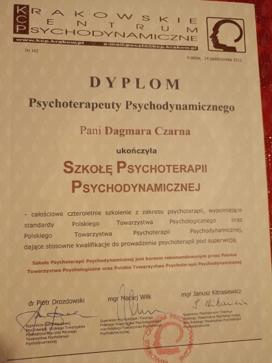 Chciałabym serdecznie podziękować Pani Dagmarze za wyjątkowe podejście i profesjonalizm w prowadzeniu psychoterapii. Cały proces odbywał się w ciepłej, życzliwej i pełnej zaufania atmosferze, co miało dla mnie ogromne znaczenie. Dzięki metodzie psychodynamicznej, w której pracuje Pani Dagmara, mogłam lepiej zrozumieć siebie i źródła różnych trudności, z którymi się mierzyłam.