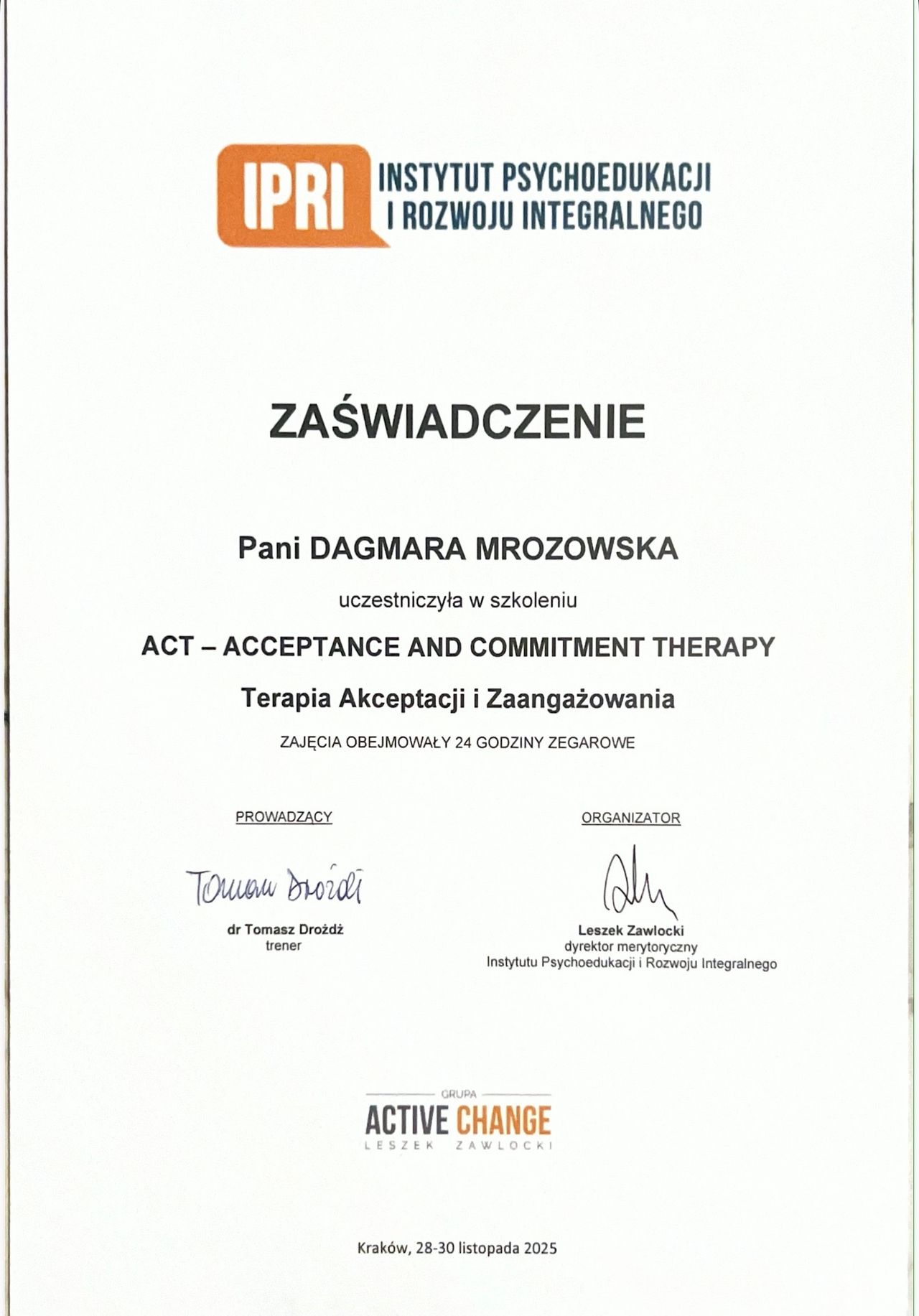 Obecnie w ramach porad psychologicznych korzystam m.in. z narzędzi Terapii Akceptacji i Zaangażowania (ACT) oraz Terapii Schematów, rozwijając jednocześnie kompetencje psychodynamiczne, które stanowią kierunek mojej przyszłej pracy terapeutycznej.