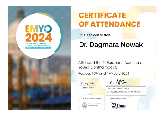 W 2023 roku zdała Europejski Egzamin Specjalizacyjny z okulistyki EBO (European Board Of Ophthalmology), a następnie kończąc szkolenie w ramach rezydentury uzyskała tytuł Specjalisty Okulistyki.