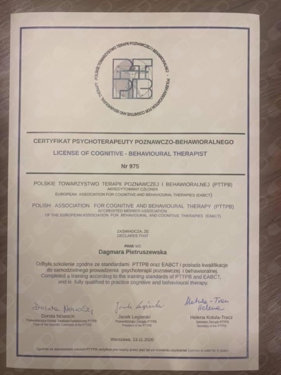 Nazywam się Dagmara Pietruszewska. Jestem psychologiem, certyfikowanym psychoterapeutą poznawczo-behawioralnym (nr certyfikatu 975) i certyfikowanym terapeutą schematów. Od kilkunastu lat pomagam pacjentom w radzeniu sobie z anoreksją, bulimią, ortoreksją, otyłością i innymi zaburzeniami odżywiania, a także z depresją, napadami paniki, PTSD, OCD, zaburzeniami osobowości (m.in. borderline) oraz problemami psychosomatycznymi.
