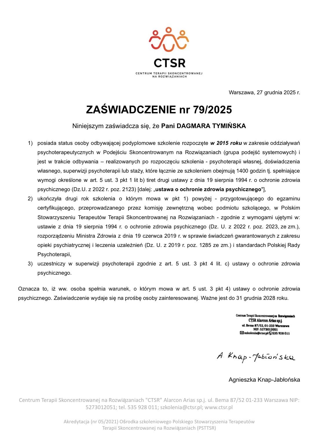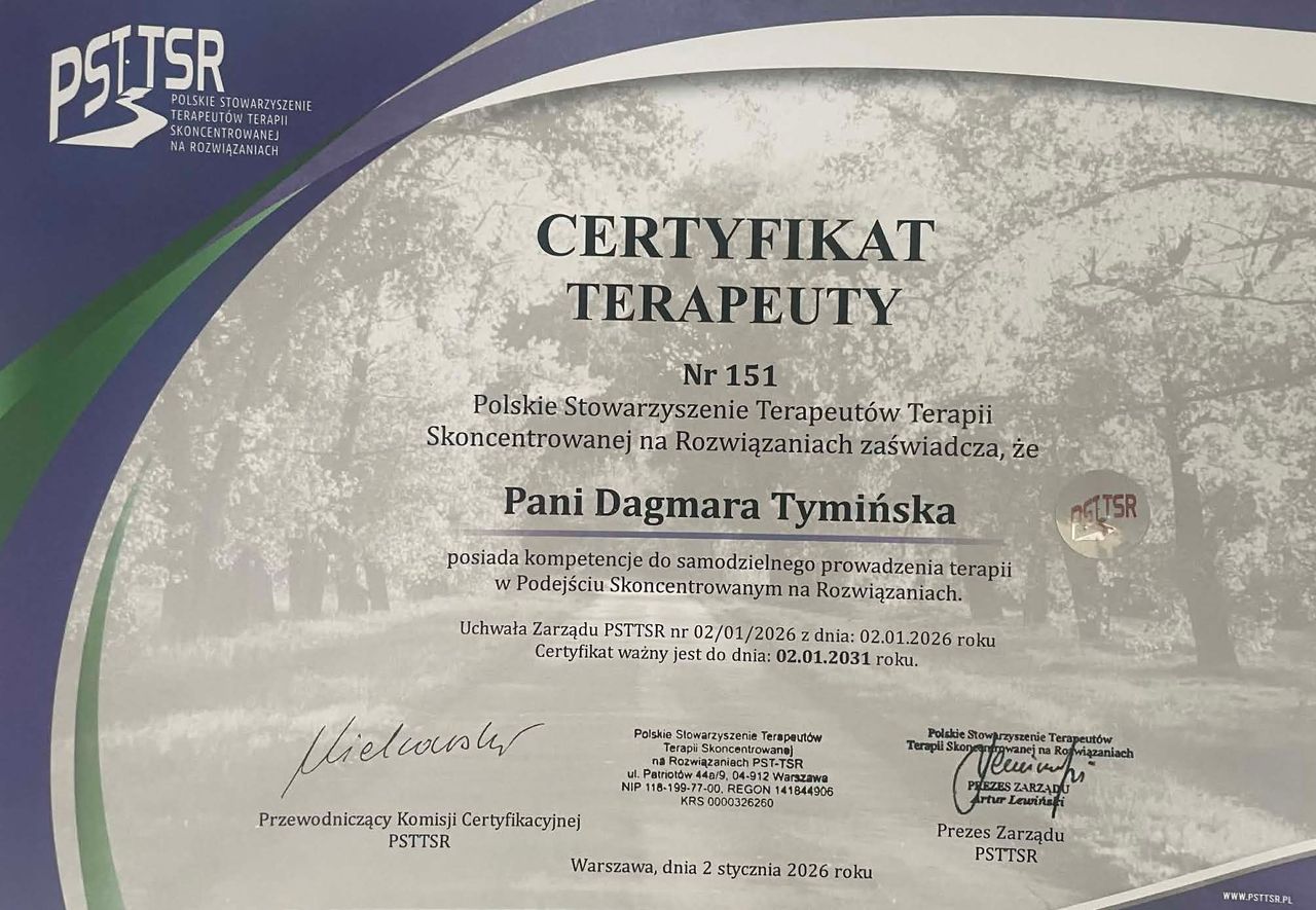 Jestem psycholożką oraz terapeutką TSR, a także psychoterapeutką w procesie szkolenia w nurcie Terapii Skoncentrowanej na Rozwiązaniach (TSR), ukończyłam również szkołę Terapii Gestalt. Należę do Polskiego Towarzystwa Psychologicznego (PTP) oraz Polskiego Stowarzyszenia Terapeutów Terapii Skoncentrowanej na Rozwiązaniach (PSTTSR).