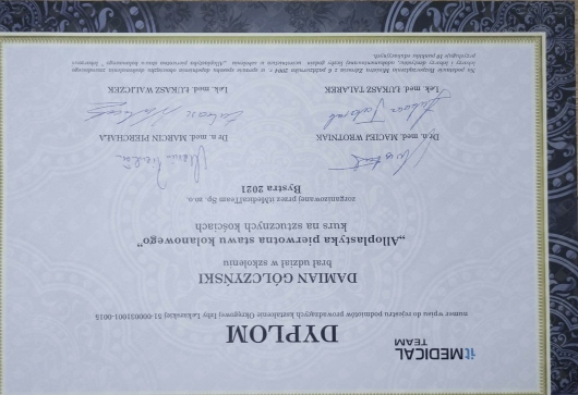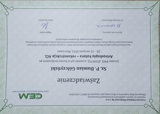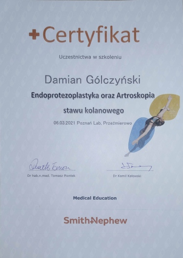 Jestem lekarzem w trakcie specjalizacji z ortopedii i traumatologii narządu ruchu w Oddziale Urazowo-Ortopedycznym Szpitala św. Łukasza w Bolesławcu, gdzie na co dzień prowadzę kompleksowe – zachowawcze i operacyjne – leczenie schorzeń układu ruchu. Dyplom lekarski uzyskałem na Warmińsko-Mazurskim Uniwersytecie Medycznym w Olsztynie. Swoje umiejętności stale doskonalę podczas certyfikowanych kursów krajowych i zagranicznych, aby oferować Pacjentom najnowocześniejsze, małoinwazyjne metody leczenia.