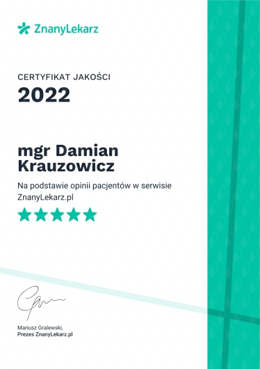 Jak Damian Krauzowicz umawia wizyty?Damian Krauzowicz używa kalendarza ZnanyLekarz, dlatego na stronie widzisz aktualne terminy. Wystarczy, że wybierzesz datę i godzinę, które odpowiadają Ci najbardziej. Umawianie wizyty jest darmowe, a tuż przed terminem wyślemy Ci przypomnienie.