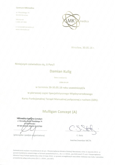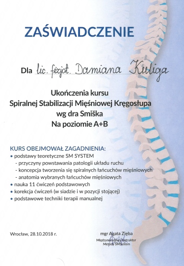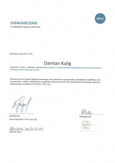 Bardzo duża wiedza, szybka diagnoza skierowana na likwidację przyczyny bólu a nie tylko jego skutku. Serdecznie polecam Pana Damiana jest to znakomity fachowiec a zarazem bardzo pozytywny człowiek. Wizyty zawsze w profesjonalnej atmosferze. Polecam.