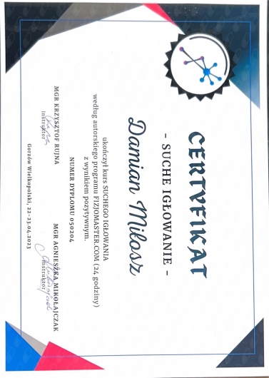 Jaki jest zakres porad oferowanych przez Damian Miłosz?Damian Miłosz to fizjoterapeuta. Na podstawie swojego doświadczenia i wykształcenia Damian Miłosz oferuje usługi takie jak: konsultacja fizjoterapeutyczna, Fizjoterapia (pierwsza wizyta), Terapia manualna, terapia powięziowa, akupunktura, terapia stawów skroniowo-żuchwowych, Terapia blizny, suche igłowanie, Masaż leczniczy.