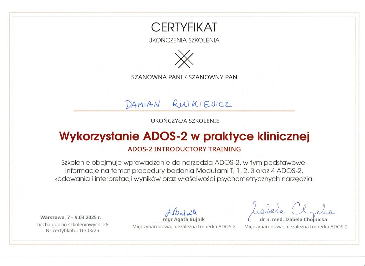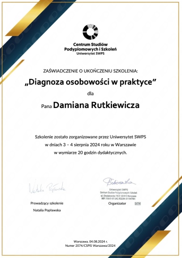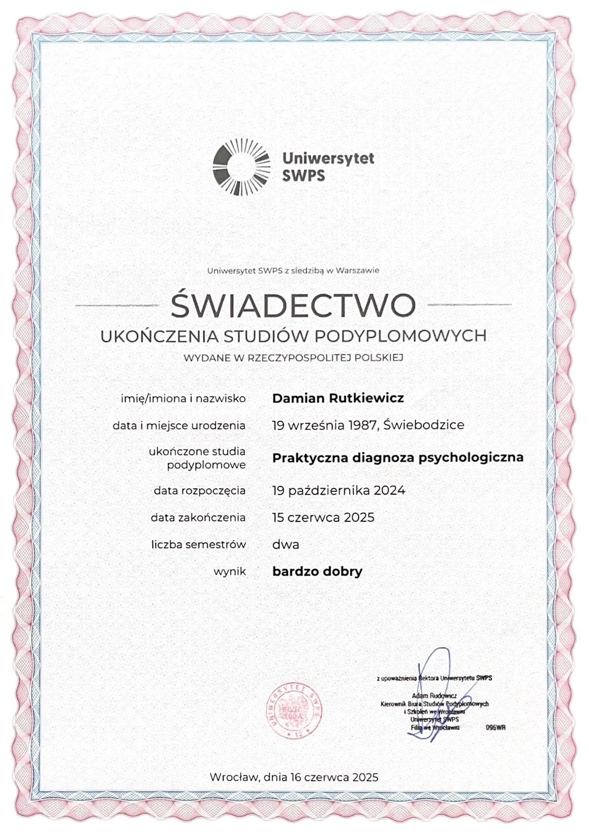 Jaki jest zakres porad oferowanych przez Damian Rutkiewicz?Damian Rutkiewicz to psycholog. Na podstawie swojego doświadczenia i wykształcenia Damian Rutkiewicz oferuje usługi takie jak: diagnoza ADHD dla dorosłych, ADHD Diagnostic test in english, Konsultacja psychologiczna (dorośli), coaching, Diagnoza zaburzeń osobowości - SCID-5-PD, psychological consultation in English online, Konsultacja psychologiczna online, psychological consultation in English, Kliniczna diagnoza dorosłych w kierunku zaburzeń ze spektrum autyzmu, konsultacja diagnostyczna.