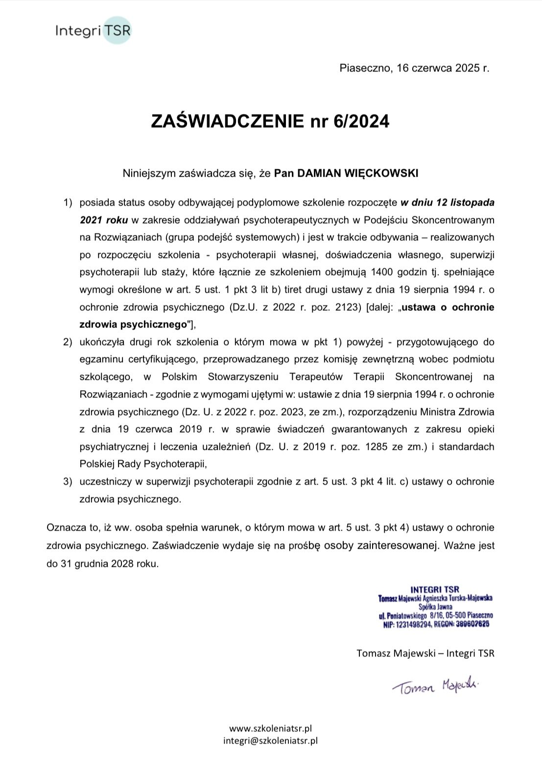 Aktualnie jestem psychoterapeutą w trakcie szkolenia w nurcie Terapii Skoncentrowanej na Rozwiązaniach.