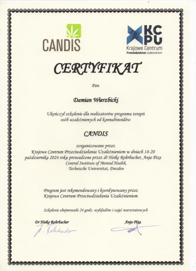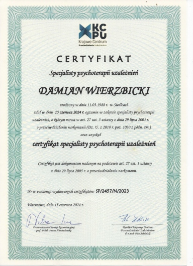 Po ukończeniu Studium Terapii Uzaleznień doświadczenie zdobywałem w Poradni Leczenia Uzależnień "Powrót z U" w Siedlcach oraz Ośrodku Rehabilitacji Uzależnień i Podwójnej Diagnozy w Otwocku. W 2024 r. uzyskałem tytuł Certyfikowanego Terapeuty Uzależnień. Pracuje zarówno z osobami uzależnionymi jak i współuzależnionymi.