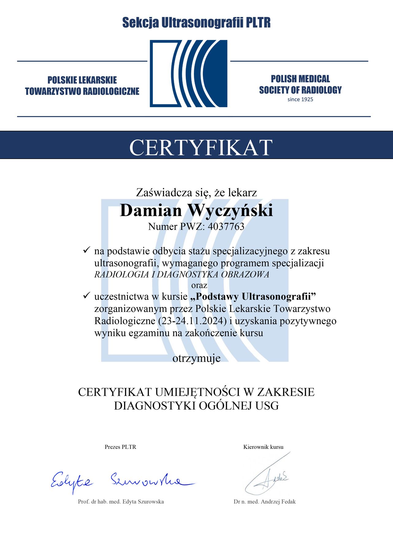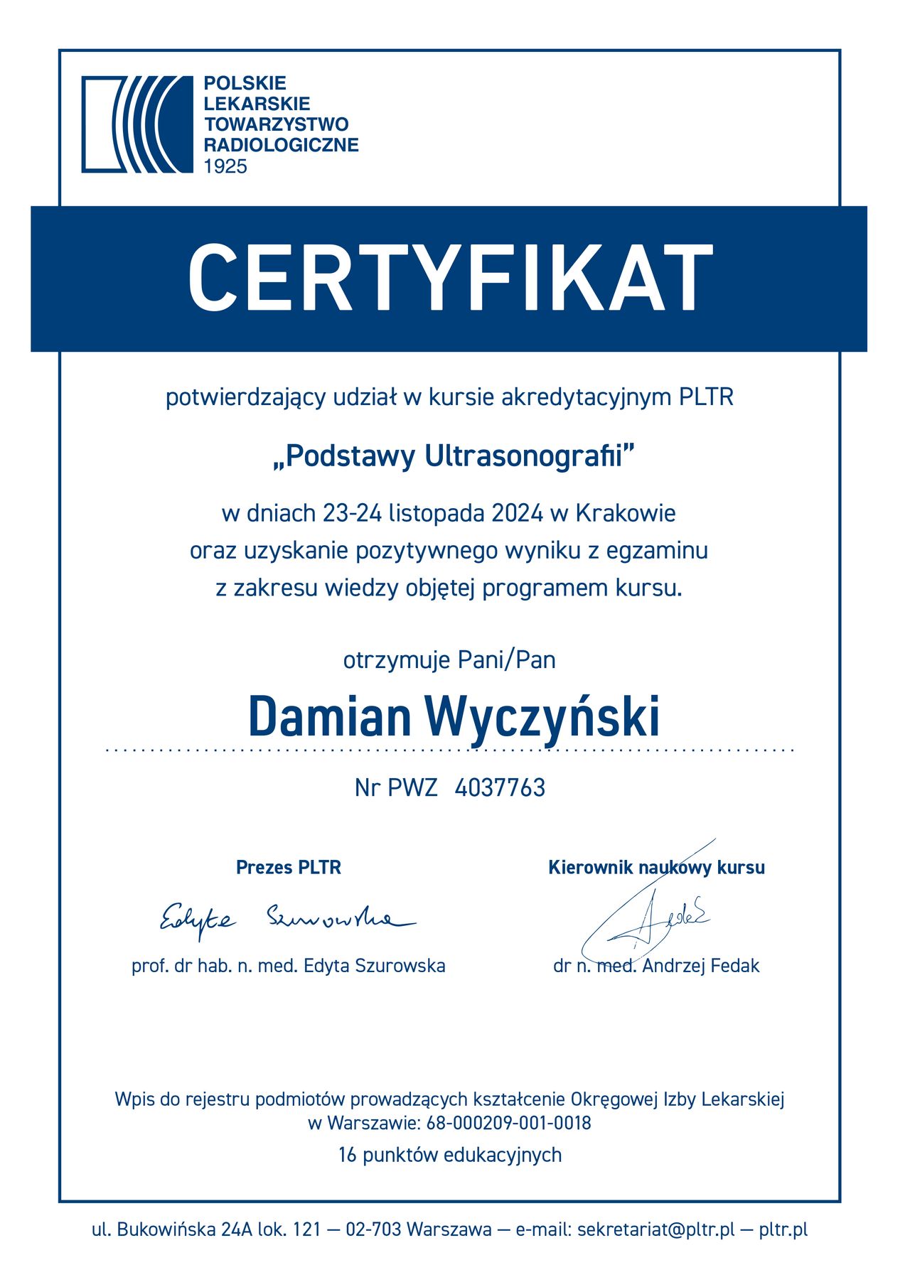 Jako aktywny członek Polskiego Lekarskiego Towarzystwa Radiologicznego (PLTR), posiadam certyfikat umiejętności w zakresie diagnostyki ogólnej ultrasonografii (USG). W swojej codziennej pracy wykonuje badania obrazowe z wykorzystaniem najnowszych technologii, co pozwala mi na precyzyjną i efektywną diagnostykę dla pacjentów.