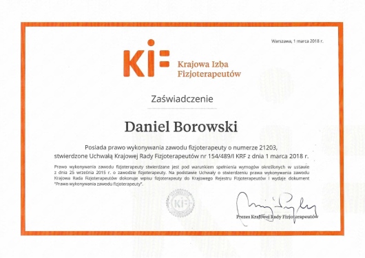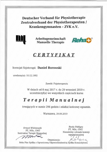 Ukończyłem z dyplomem terapię manualną metodą niemiecką, która opiera się na dokładnej diagnostyce zaburzeń narządu ruchu oraz jednoczesnym ich leczeniu. Dzięki rozbudowanemu schematowi badania różnicującego pozwala na postawienie hipotezy zaburzenia oraz zastosowanie odpowiedniej terapii. Jest to niezwykle skuteczna metoda w pracy z bólem pochodzenia stawowego, nerwowego oraz mięśniowego. Pacjent po terapii wie skąd powstaje jego ból i jak temu zaradzić aby ból nie wracał.