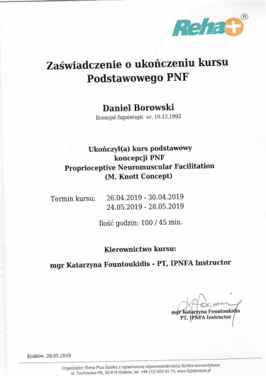 Dodatkowo w pracy z pacjentem często wykorzystuje wiedzę z kursu PNF jako elementy treningu funkcjonalnego.