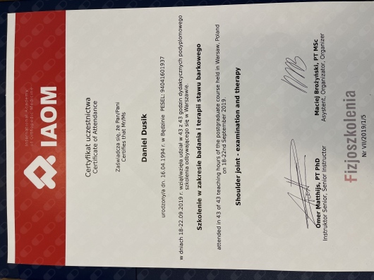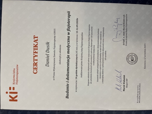 Jaki jest zakres porad oferowanych przez Daniel Dusik?Daniel Dusik to fizjoterapeuta. Na podstawie swojego doświadczenia i wykształcenia Daniel Dusik oferuje usługi takie jak: konsultacja fizjoterapeutyczna, rehabilitacja neurologiczna, kinesiotaping, rehabilitacja ortopedyczna, rehabilitacja sportowców, Terapia manualna, terapia powięziowa, terapia przeciwbólowa, Konsultacja fizjoterapeutyczna (Niedziela i Święta), fizjoterapia.