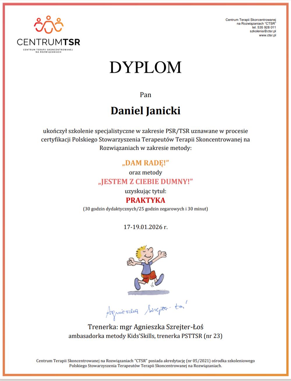 Pan Daniel jest bardzo sympatyczną osobą. Sama osobiście nie chodzę na sesję tylko córka. Od pierwszego spotkania wzbudza zaufanie.Jeżeli coś mnie niepokoi zawszę mogę liczyć na Pana Daniela.Córka jest zadowolona z spotkań i chętnie na nie chodzi. Wierzę w to że idziemy ku dobremu.