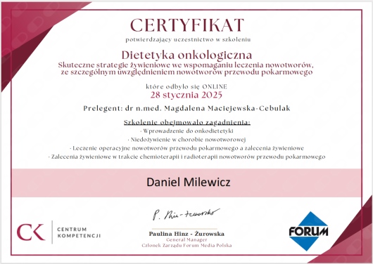 W ramach przygotowania się do konsultacji dietetycznej warto zrobić: morfologię z rozmazem, lipidogram, glukozę i insulinę na czczo, mocz ogólny, próby wątrobowe (ASPAT, ALAT, GGTP), żelazo, ferrytyna, TSH, FT4 lub przynieść najbardziej aktualne wyniki badań dotyczące swojej jednostki chorobowej. Od 13 lat jestem dietetykiem i psychodietetykiem, praktykiem specjalizującym się w ciężkich jednostkach chorobowych jakimi są m.in: (choroby układu pokarmowego) uchyłki jelit, nadżerki, stany zapalne, wrzody, gastropatię, opieka po operacjach bariatrycznych, a od 7 lat bardzo intensywnie pracuję z pacjentami chorymi na anoreksję, bulimię oraz kompulsywnie objadającymi się. Jestem osobą dla której druga osoba stanowi najwyższą wartość. Podchodzę do człowieka wszechstronnie szukając przyczyny powstawania chorób i problemu. Jestem przeciwnikiem leczenia objawów, które może być podłożem do rozwoju innych jednostek chorobowych. Sam będąc zawodnikiem biegów górskich, prowadzę zawodników i osoby aktywne fizycznie w ułożeniu planów żywieniowych pod trening lub zawody, aby czerpać maksymalne korzyści fizjologiczne. Doświadczenie zdobywałem i nadal zdobywam na górskich szlakach uczestnicząc w zawodach w dystansach 100 km, 240 km i 330 km. Motywują mnie wyzwania i praca z trudnymi pacjentami. Praktykuje w przychodni od 2010 roku mając również pod swoją opieką pacjentów, którym pomogłem zgubić nawet 65 kg. Od kilku lat prowadzę pacjentów po operacjach bariatrycznych. Moje doświadczenie Specjalizuje się w ciężkich jednostkach chorobowych jakimi są m.in: - (choroby układu pokarmowego) uchyłki jelit, nadżerki, stany zapalne, wrzody, gastropatię, opieka po operacjach bariatrycznych, - pracuję z pacjentami chorymi na anoreksję, bulimię oraz kompulsywnie objadającymi się. - praca ze sportowcami ( piłkarze wyższych lig dorośli i młodzież, biegacze górscy i uliczni , siłownia, zawody i osiąganie wagi do zawodów ) Zgłoś się też jeżeli: - masz problem z regeneracją lub utrzymującym się zmęczeniem po treningach - często dopadają Cię kontuzję lub przetrenowanie, - chcesz osiągać lepsze wyniki w zawodach, - masz problem z przybraniem i utrzymaniem masy mięśniowej, - masz problem z nadwagą, - masz zaburzenia hormonalne, - przewlekłe zmęczenie. Pamiętaj: Sport to nie tylko trening…