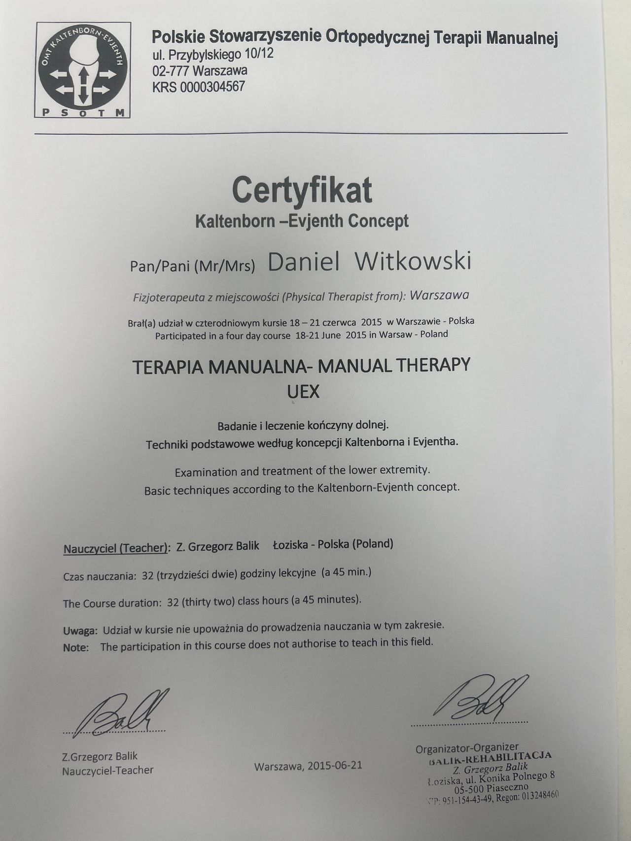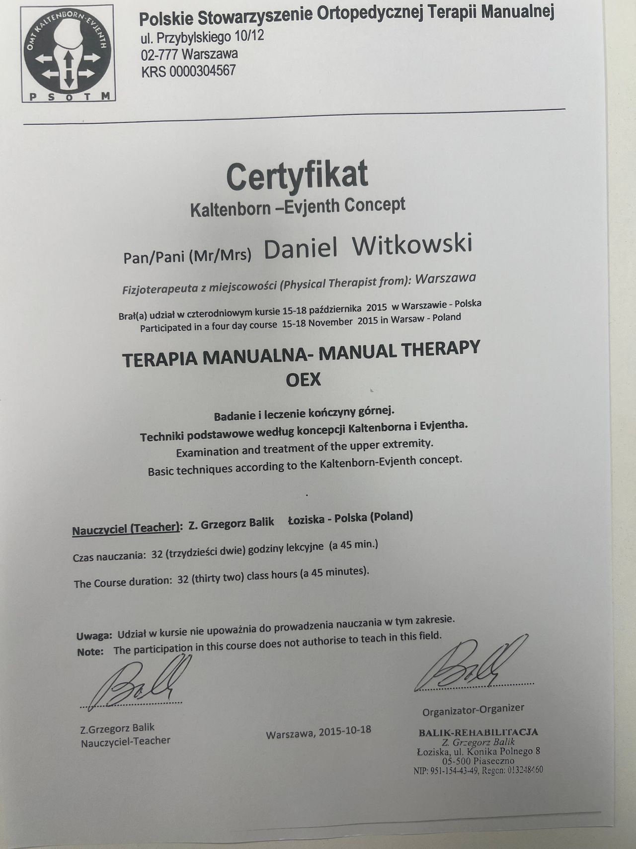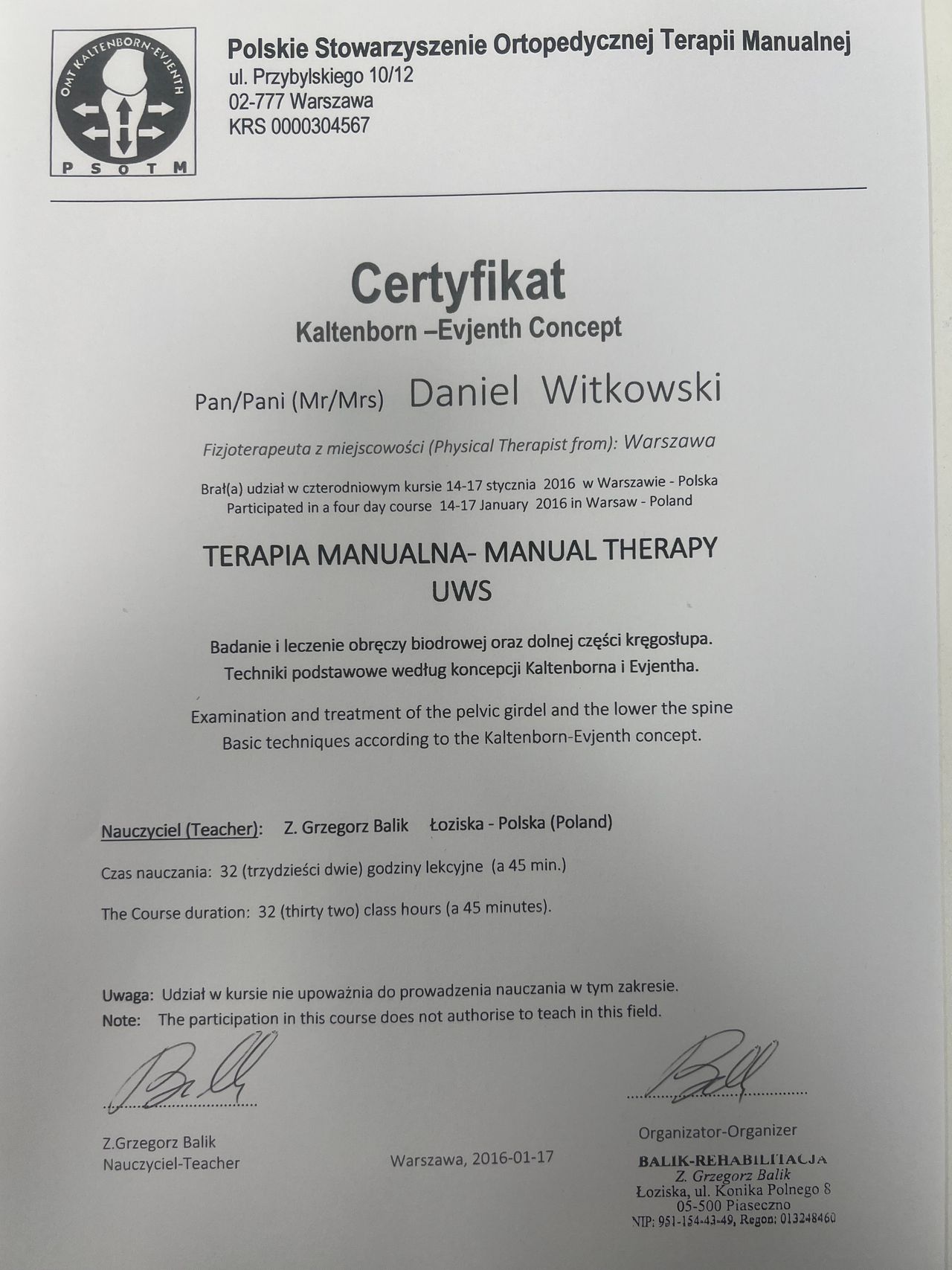 Z całego serca polecam Pana Daniela jako wyjątkowego specjalistę w dziedzinie fizjoterapii. Już od pierwszej wizyty dało się odczuć ogromną empatię i zaangażowanie. Pan Daniel z uwagą wysłuchał wszystkich objawów, zadał szczegółowe pytania i bardzo wnikliwie podszedł do diagnostyki, starając się dotrzeć do rzeczywistej przyczyny problemów. Dzięki niemu zacząłem chodzić. Przed wizytą danie jednego kroku, czy stanie to ból, silny ból, a nawet bardzo silny. Już po pierwszej terapii mogłem chodzić, co prawda z lekkim bólem. A później tylko coraz lepiej. To profesjonalista z prawdziwego powołania, który łączy fachowość z ciepłym, ludzkim podejściem.