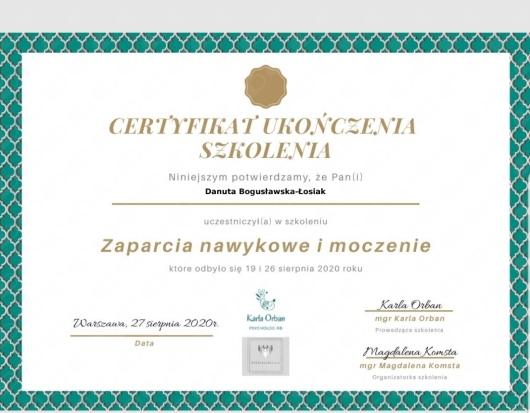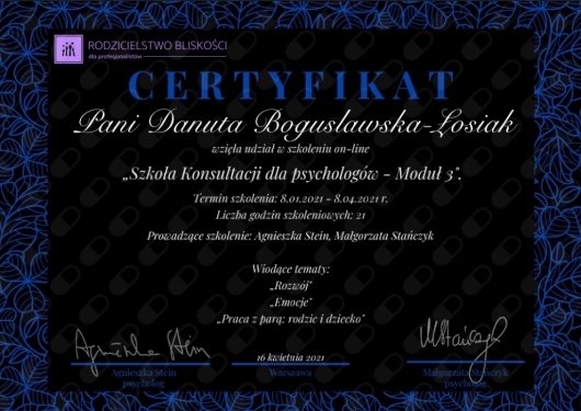 Nazywam się Danuta Bogusławska-Łosiak. Jestem psychologiem, psychoterapeutą poznawczo-behawioralnym w trakcie szkolenia, pedagogiem, certyfikowaną terapeutką behawioralną. Ukończyłam psychologię i pedagogikę na Uniwersytecie Łódzkim oraz roczne szkolenie z zakresu terapii poznawczo-behawioralnej dzieci i młodzieży w Centrum Poznawczo-Behawioralnym w Łodzi. Obecnie jestem w trakcie czteroletniego, podyplomowego szkolenia z psychoterapii poznawczo-behawioralnej w ramach szkoły Psychoterapii Crescentia. Pracuję z osobami doświadczającymi kryzysu, zmagającymi się z niską samooceną, cierpiącymi na zaburzenia lękowe, depresyjne. A także z osobami, które nie zgłaszają żadnych dolegliwości, ale chcą sięgnąć po rozwój wewnętrzny. Pracuje terapeutycznie z osobami dorosłymi, młodzieżą i dziećmi. W swojej pracy wykorzystuje techniki nurtu poznawczo-behawioralnego, terapii schematów i terapii akceptacji i zaangażowania (ACT). Ważnym obszarem mojego doświadczenia zawodowego jest tematyka autyzmu i ADHD. Zajmuję się diagnostyką zaburzeń neurorozwojowych i pracą terapeutyczną z osobami z zaburzeniami neurorozwojowymi. Uważam, że niezmiernie istotne jest popularyzowanie wiedzy na temat autyzmu, wczesna interwencja terapeutyczna oraz wsparcie rodziców, którzy mierzą się z otrzymaniem diagnozy swojego dziecka. Współpracuję z placówkami oświatowymi oraz prowadzę grupy wspracia dla rodziców. Udzielam także konsultacji rodzicielskich w nurcie rodzicielstwa bliskości i porozumienia bez przemocy (NVC). Swoją pracę poddaje regularnej superwizji (superwizor Agnieszka Madej). Jestem członkiem Polskiego Towarzystwa Terapii Poznawczej i Behawioralnej (PTTPB). A prywatnie żona, mama dwójki szalonych dzieciaków i właścicielka psiaka rasy shih-tzu. Ładuję akumulatory podczas obcowania z naturą, czytania kryminałów i amatorskiej jazdy konnej. Zapraszam do kontaktu.