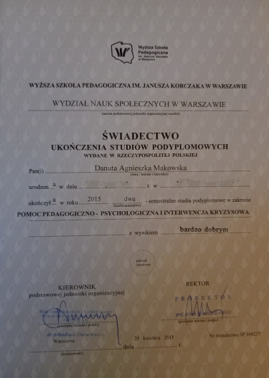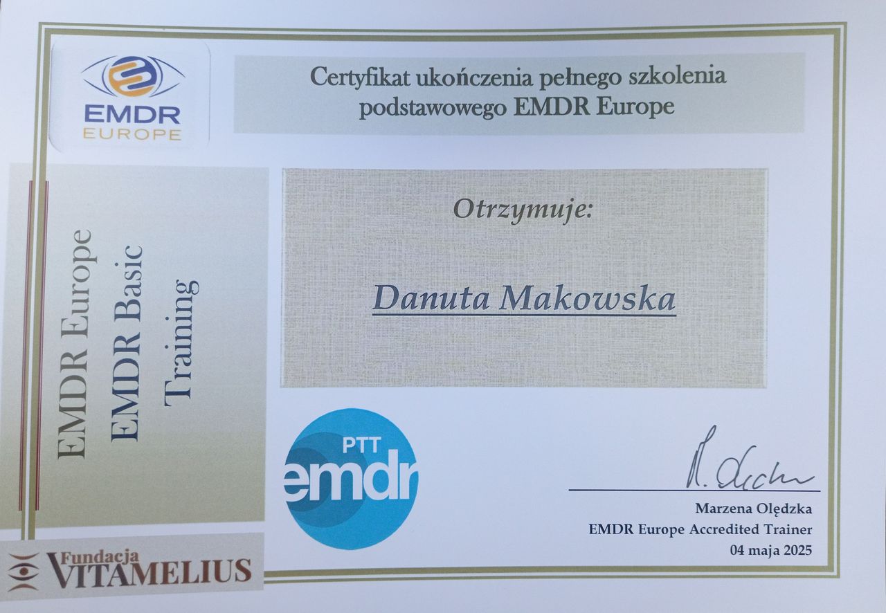 Jestem psychoterapeutką w procesie certyfikacji, terapeutą EMDR ( praca z traumą), terapeutką par, mediatorem rodzinnym. Ukończyłam całościowe 4-letnie szkolenie psychoterapeutyczne, akredytowane przez Sekcję Naukową Psychoterapii Polskiego Towarzystwa Psychiatrycznego i Sekcję Naukową Terapii Rodzin PTP, którego głównym nurtem w programie szkolenia jest podejście psychoanalityczno- psychodynamiczne. Jestem członkiem Polskiego Towarzystwa Psychiatrycznego i Sekcji Naukowej Psychoterapii; Pracuję zgodnie z Kodeksem Etyki zawodowej psychoterapeuty. Pracuję pod superwizją u certyfikowanych superwizorów PTP i EAGT.